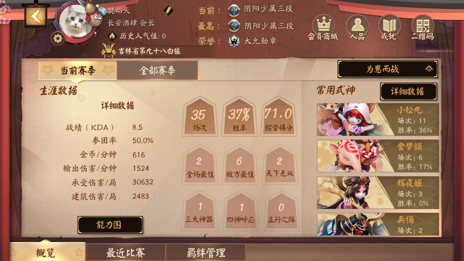 少属,平时总爱玩百鬼奕打了1100来场,每个赛季打到大暑就不打了。匹配练小松丸把我自己玩笑了,我寻思着我再菜也不至于胜率跌到40以下吧,况且我也不是那种无可救药的菜鸟啊哈哈,我带不飞好歹中规中矩能打团能看信号能拿地图资源能推塔,怎么赢一局这么难?