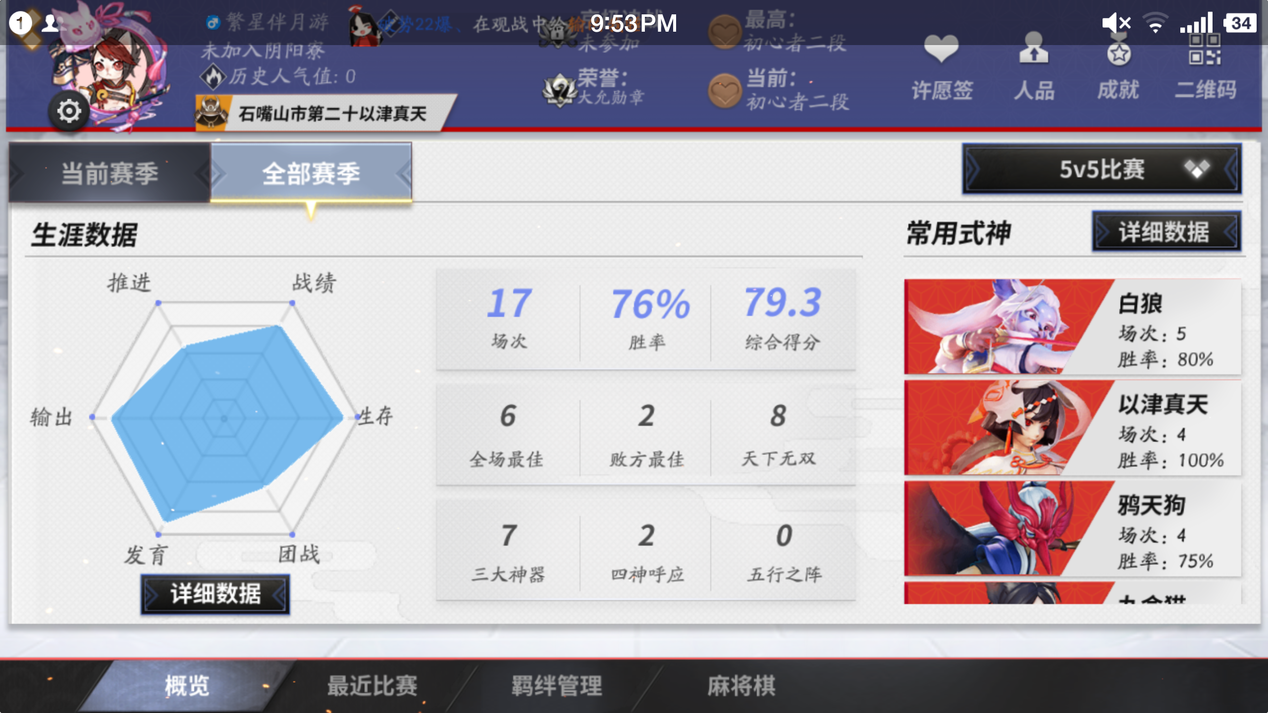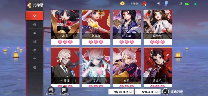 其实只是早些年抽金达摩抽上头了而已诶嘿~还有一些式神还没买皮肤已经齐了最后放个主页图叭,开服玩家到现在玩的不多w基本主辅副中~