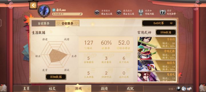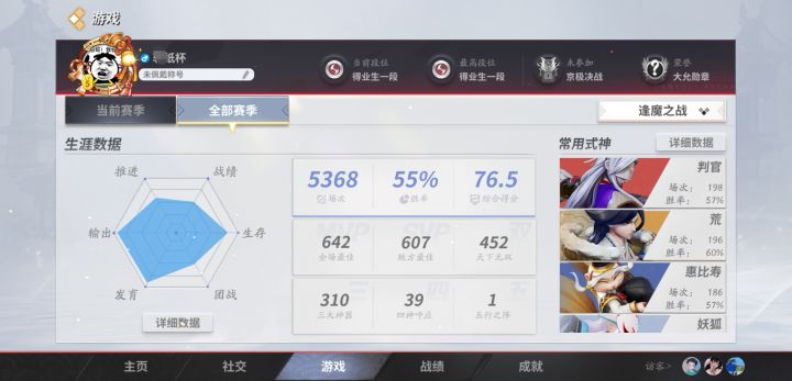 逢魔还有比鸦天狗更无脑的式神吗?出个吸血、金身,再把冷却拉满,直接无敌。纯输出鸦天狗打穿一个纯肉也就两三秒。匣子技能控制的时间还没到就被打死了,大招都来不及放。打脆皮更是直接秒杀。哪边选到哪边赢,大概没削过的犬神才能与之一战,这种式神没存在的必要了吧我觉得?建议和山童一起滚出逢魔贴张我的逢魔战绩,不算高,中规中矩,应该能代表大多数普通人的水平。