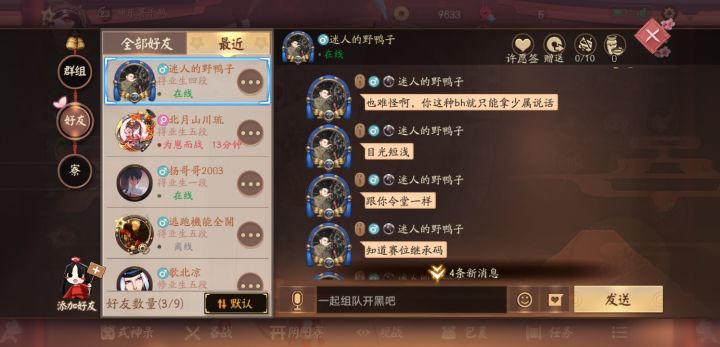 连输,心态爆炸,队友瞎几把带节奏也是牛啤。打到少允三段四火死活打不到四段,只要赢了一局必定匹配zz队友,还无视段位那种,心累,总感觉少允还不如大属段位玩的好。😓😓
