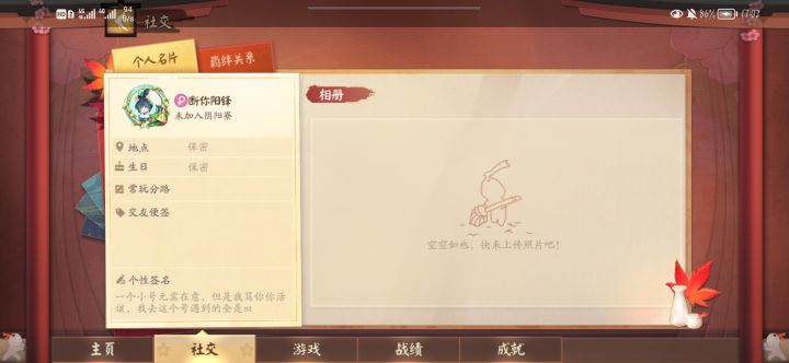 平安京,你要不出一个开局之前预选位置吧,我都不想喷你那些优化呀,bug什么的了,队友实在难搞呀。刚刚一场游戏,我本来想着打个般若,稍微再练一下,结果我人物都选好了,队友九次良让我换,我想这相信他一下,然后看着山兔预选御馔津,我想着就打个辅助呗,选了个有控有伤害的祢豆子,结果调完阴阳术才发现队友选了个山兔。然后开局没多久,九次良0-3,海忍,拿了个头没多久就挂机了,投吧,他们又不投,就硬坐牢,硬打。本来我打这个游戏简单陪朋友娱乐一下,结果成功变成了治疗低血压的神器(段位得业到少允,牛马极多),真的给孩子整自闭了