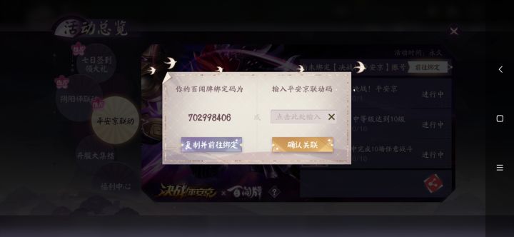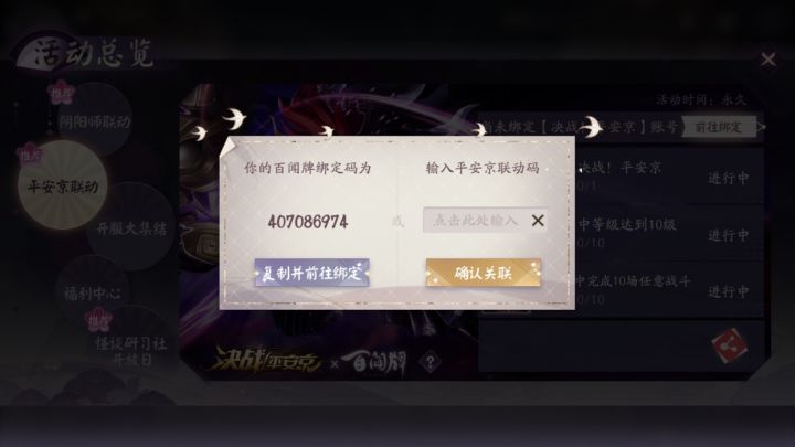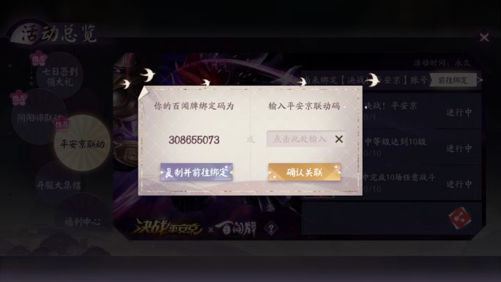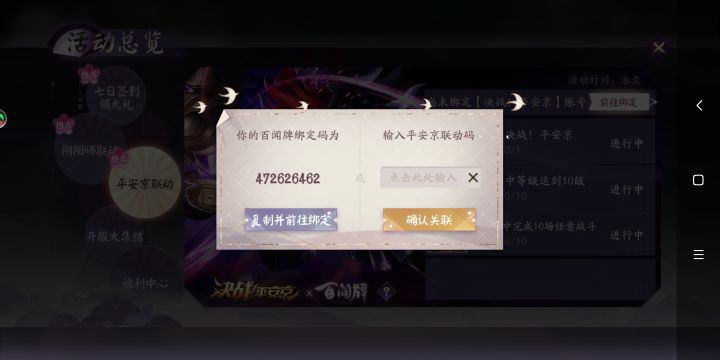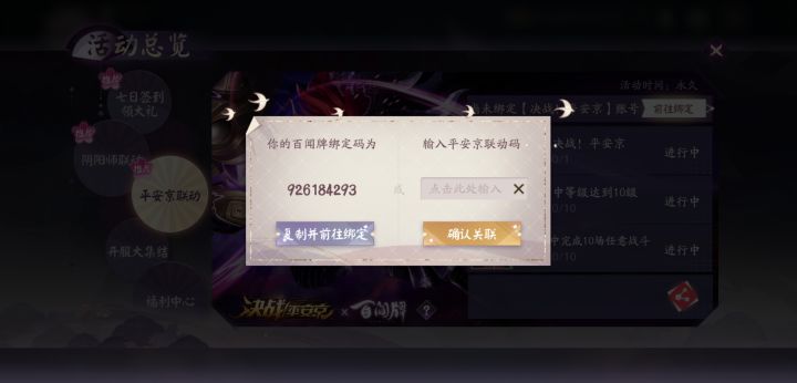 谁帮忙联动下百闻牌的活动,跪谢。在你的平安京游戏界面里绑定我的百闻牌碼,你也可以得联动的东西。我的百闻牌碼是629943485,求活跃平安京玩家联动。