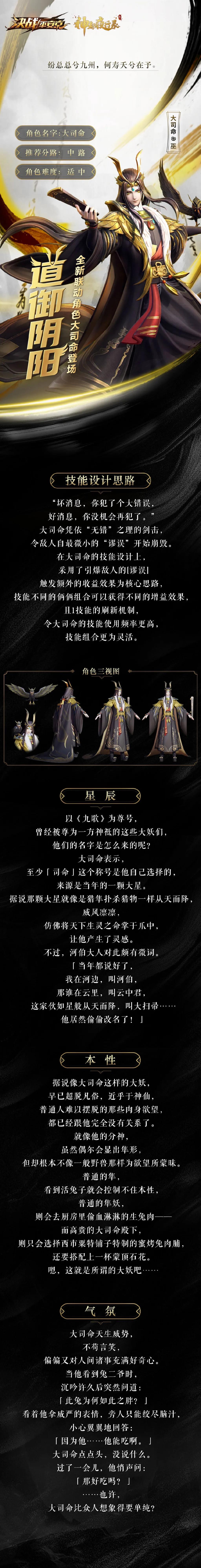 乘清气兮御阴阳秉公正以束行事九州下定夺是非天命断世间纷繁善恶之念皆于一黑玉朝简方寸之间全新联动角色「大司命」将于6月12日维护更新后正式加入平安京战场,定位为【巫】。《神都夜行录》×《决战!平安京》联动即将正式开启,大大们敬请期待~