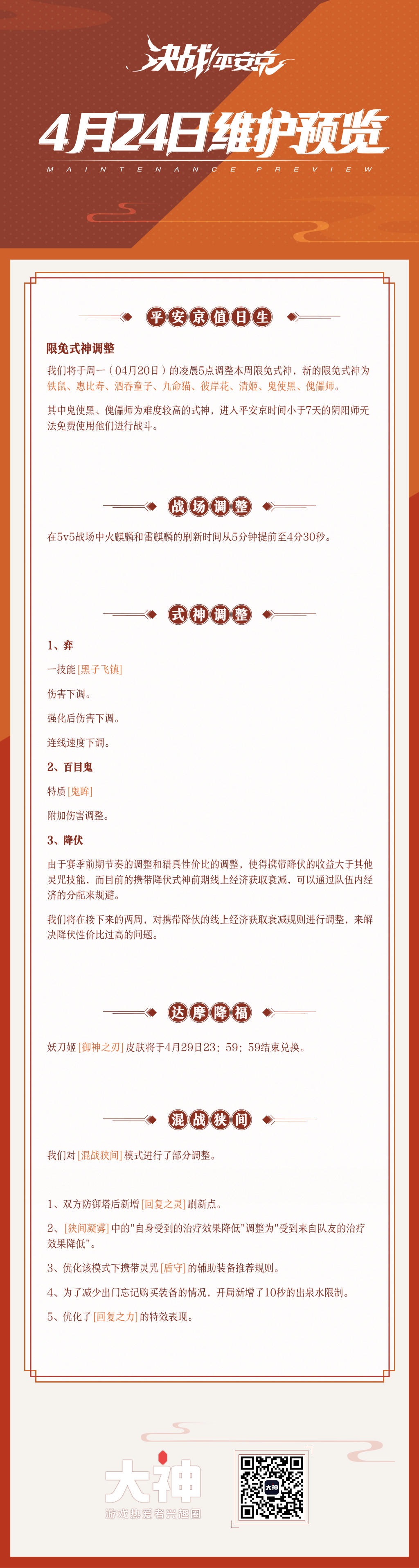 ☆维护公告☆亲爱的阴阳师大人:现奉上《决战!平安京》4月24日的维护公告(转载已获官方授权)