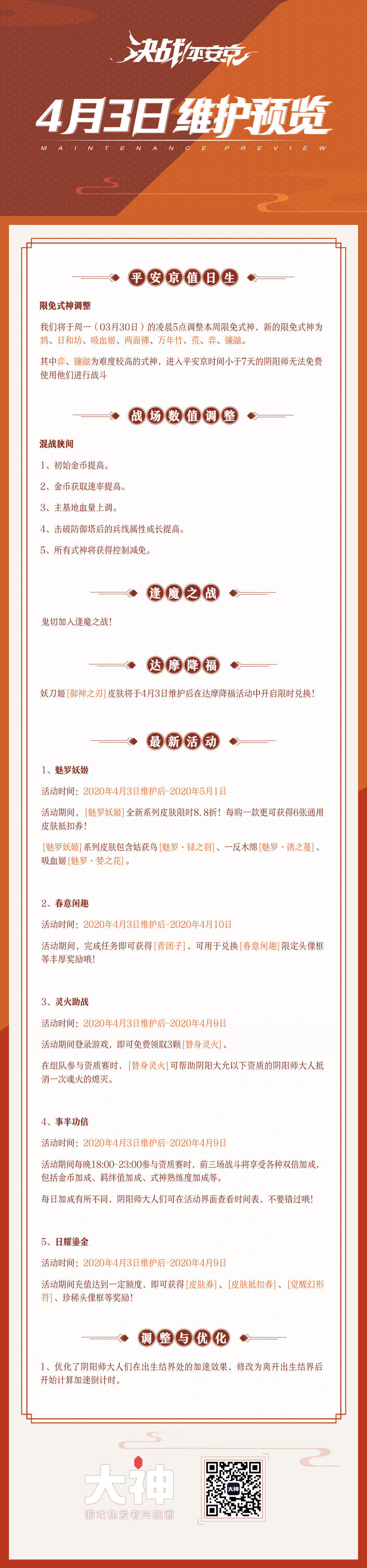☆维护预览☆各位大大们下午好!樱子来为大大们奉上本周维护预览~【樱子小贴士】▷「魅罗妖姬」全新系列3款皮肤同时上架皮肤铺,享限时8.8折~▷混战狭间战场优化啦▷春意闲趣,[春意闲趣]限定头像框等奖励等你哟▷妖刀姬「御神之刃」皮肤将在达摩降福活动中开启限时兑换▷本周有充值活动▷赛季冲分活动即将开启▷鬼切本周加入逢魔之战详细内容请戳下图↓↓↓(转载已获官方授权)新式神剪影还不