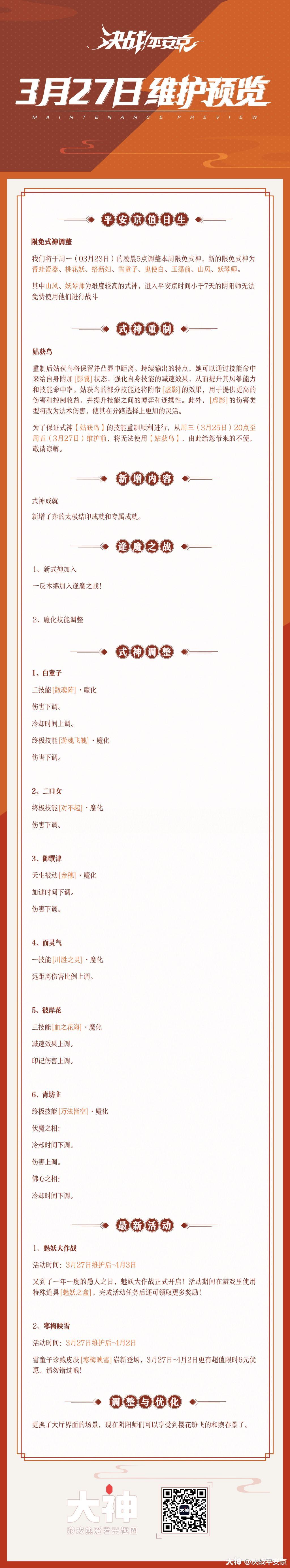☆维护预览☆各位大大们下午好!樱子来为大大们奉上本周维护预览~【樱子小贴士】▷为了保证式神【姑获鸟】的技能重制顺利进行,从周三(3月25日)20点至周五(3月27日)维护前,将无法使用【姑获鸟】,由此给您带来的不便,敬请谅解。▷雪童子珍藏皮肤「寒梅映雪」即将崭新登场,享首周超值6元秒杀,机不可失哦~▷愚人节来袭,搞怪道具登场▷一反木绵将于本周加入逢魔之战(转载已获官方授权)