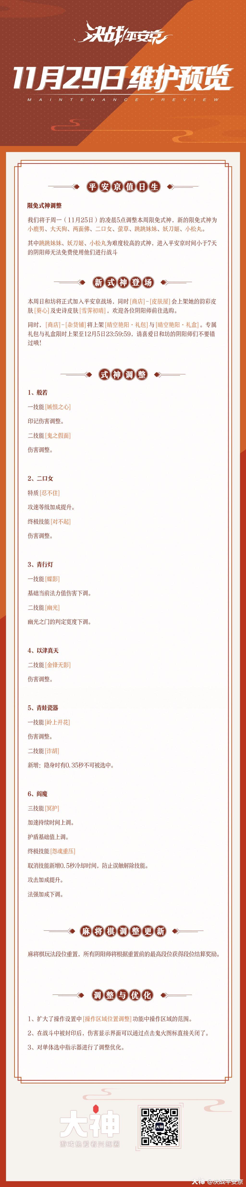 ☆维护公告☆亲爱的阴阳师大人:现奉上《决战!平安京》11月29日的维护公告。今日维护已完成,大大们可以进入游戏愉快的玩耍啦~(转自官方,已授权)