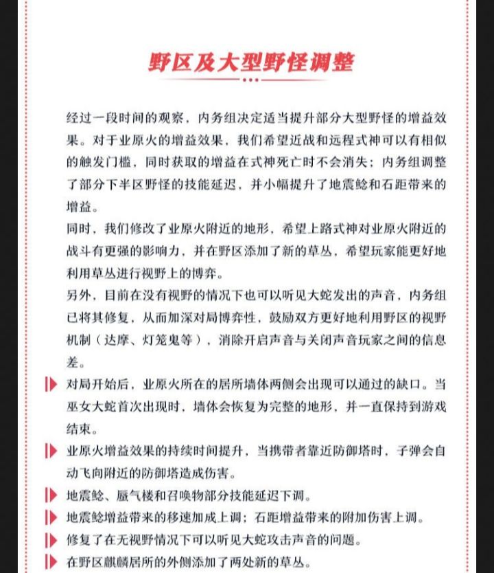 挑主要的一共分为了三个部分第1个野区调整1,增加了一个10分钟前的两侧缺口,这个个人认为用处其实不大,就多了这个缺口,其实上路下来支援也少不了几步路2,业原火这个持续时间提升和自动攻击,这我觉得就是很大的一个提升了,因为以前你要去摸到防御塔,现在你不用去,就直接顶着对面压力,把兵推到防御塔里面就可以了3,提升石距跟地震鲢,首先石距纯属就是乐呵,他加那点伤害更多就是个鸡肋。鲶鱼的话它的移速也