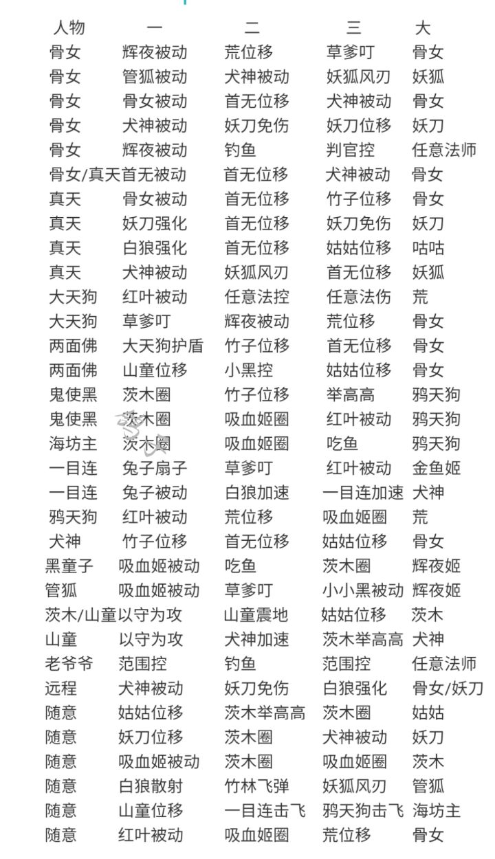 我自己总结的几个组合如下技能带普攻(技能特效流?)技能(有石距攻击上八百)血魔(要伤害干嘛,恶心对面几个人)控制(被锤子天克)射手(以下适用于妖刀免伤白狼强化妖狐被动犬神被动,管狐被动首无被动小黑被动需要将重矢冥穿分裂双穿换成天之麻迦古弓减疗弓大穿)法师(没蓝条的竹子吸血姬犬神老爷爷不需要出回蓝书和天女,可以第一件神意或者天之尾羽张,带红叶大或者减速流恶心人的可以第一件山吹花烬)骨女