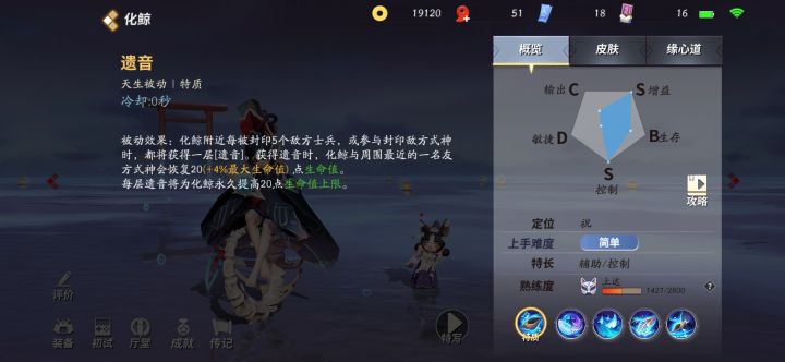 被动遗音(通俗解释):在队友旁边助攻即可恢复自身与队友血量,自身血条上限+被动鲸甲通俗解释:左滑(体甲)团战时候用,右划(齿甲)逃跑,追击对面用二技能水袭通俗解释:消耗用,尽量靠近用三技能鲸波通俗解释:可以理解为变相钩子大招唤海溺螺通俗解释:咬住一个人团战顺序2-3-4-1队友坦度够高:以对面双c为大招优先顺序脆皮阵容:以对面上单和打野为大招优先顺序出装:普通辅助出装(买了足具格
