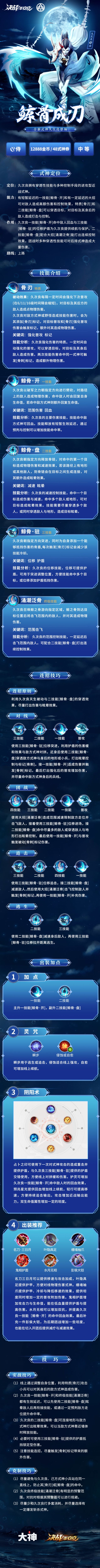 鲸骨成刃,戍守麓海!久次良已于今日正式降临平安京的战场啦!作为进攻型近战式神,久次良可对敌人造成高额伤害与控制效果,还可以穿透目标,对敌人造成打击与控制,如何使其近战输出能力最大化,在对局中打出最佳效果呢?樱子特此奉上一份玩法攻略,希望可以帮助大大们尽快上手新式神~Ps:新式神【久次良】可在商店中免费获取,大大们记得上线领取呀