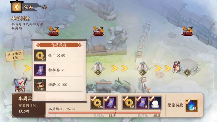 1.每日任务里面,一天打满4场可以额外获得240金币。第一场第二场第四场一周下来可以得到240×7=1680,加上15场与25场的额外附加,就是1680+588+888=3156,一周下来每日任务可获得金币*3156。每周可获得神秘卷*612.平安京每周通过对局可获得的金币上限为4200。招财福额外加成是不算在里面的。如果你一周打满每日任务和金币上限可以获取金币*7356*七日