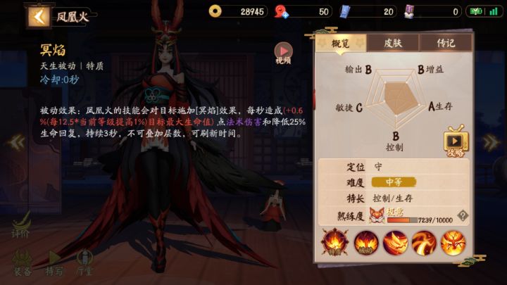 由于本人以前写过一遍凤凰火攻略,但我觉得还是有些不足,而且凤凰火最近被加强,所以那拿出来分享给大家被动目前自带减疗的式神有三个,其中有鬼使白和首无,相当于自带一个小减疗甲,在对抗一些回复能力高的式神比较有效一技能提升强化自己技能的被动(前期点两级就够了)二技能这是主力输出技能三技能控制和保护技能四技能回复自身(请看准时机)