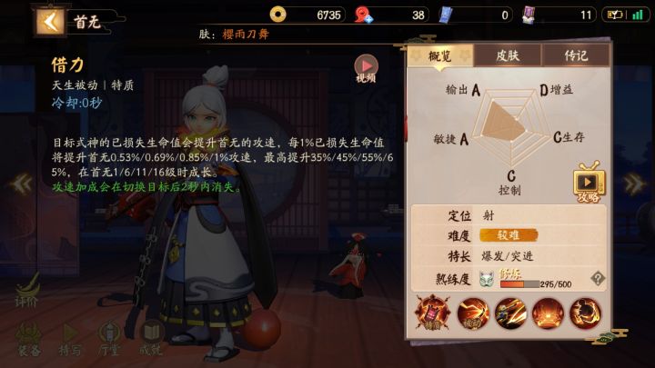 这是来自一个一年多游戏时间仍然没上过大允的菜鸡,不对或者缺漏的地方望海涵 …………………………分割线………………………… 一、(开篇废话)首无是个强势期在中后期的式神,一般大典太一出,经济没落下太多,首无无惧大多数ad,毕竟被动一鞭子爆击谁都遭不住~( ̄▽ ̄~)~二、技能介绍天生被动:你血越少我越兴奋(借力),简单理解就是地方血线越低你的攻速也会相应提高,所以首无不需要太多攻速装备。被动:吃