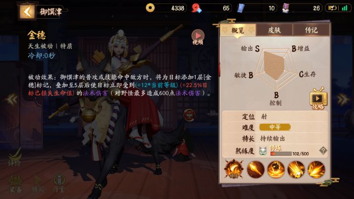 刚玩一天我就敢膨胀到写攻略,哎嘿嘿开门见山,咱们走起天生被动:金穗我滴个妈啊,当初看到御馔津的时候这特么什么恐怖的伤害,22.5%目标已损失生命值,还有等级层数,注定了这个是大后期式神,前期换血的时候也可以利用被动打出意料之外的伤害一技能:封魔矢我滴个鬼鬼,伤害一个比一个还恐怖,别看这丫的基础伤害低【也不算低吧】这个额外ad1.6加成也太恐怖了。而且还能叠两层金穗,打的准的话真的很恐怖,