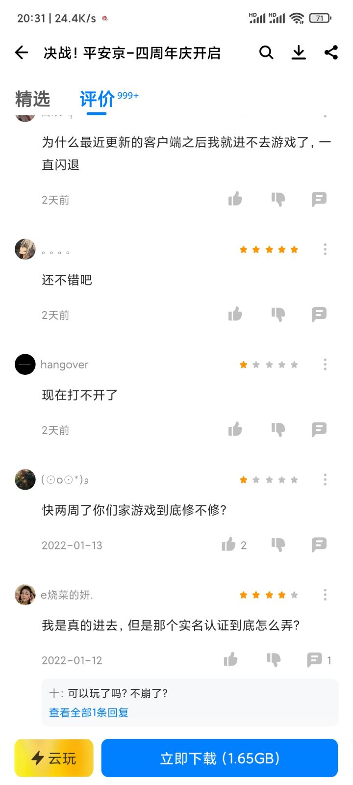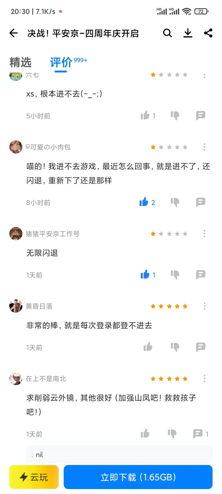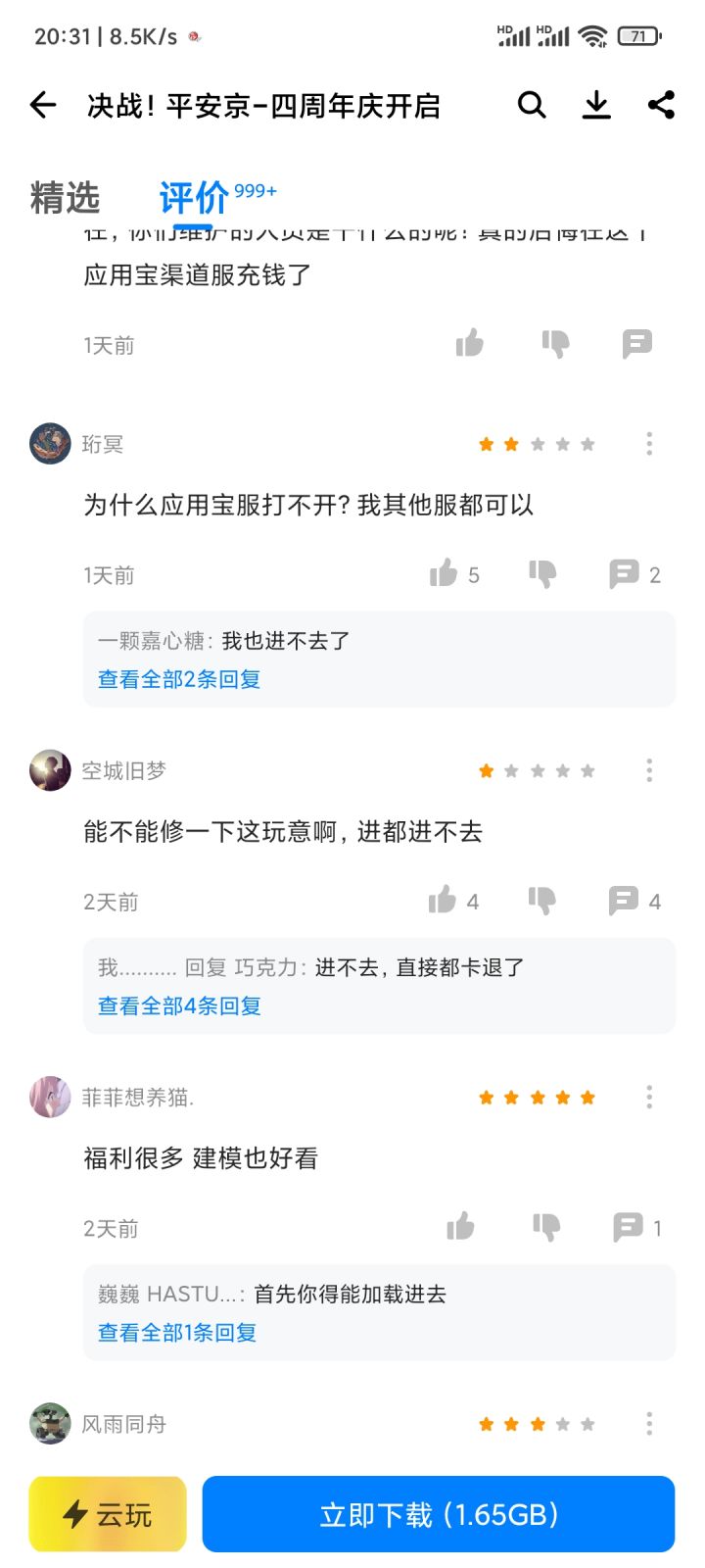 平安京应用宝渠道服闪退的问题怎么还没修?应用宝也没个反馈渠道,评论都没人看是吗?好家伙真就连个周年纪都不让过是吧。