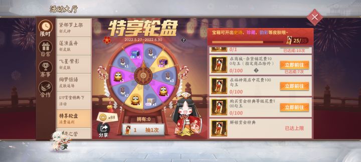 不是全平安京就我一个被吞票了吧?今天买了赏金令……他说好要给我4票的,等我高高兴兴跑到转盘那里的时候,他居然说已经到达上限了,确实这次活动赏金令也只能买一次,上限也确实只能有1…但是你先把4张票给我呀!!!我翻来覆去都不见到票…不是有什么机制我不懂吧?