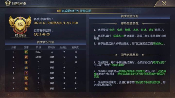 赛季重置分配1、赛季资源"士兵、伤兵、粮草、木材、石材、铁矿"保留1/22、赛季结算时,国家科技将会重置,需要在新的赛季重新捐献升级3、赛季结算后进入停战阶段时,您可以在国家页面切换势力,
