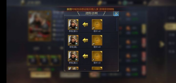 战力组成=武将进阶+升级+装备进阶+等级+科技点+统御属性,这些弄好了战力起的很快。1、武将进阶品质不同消耗的低阶武将也不同。举例李牧看着例子就知道高品质武将要求的卡片越多而且越好,当然也更厉害。2、装备进阶一般起手蓝装,灰影大家可以看到升一阶要一张卡升越高用的越多而且钱越多。前4阶是一张卡,5阶是2张6阶是3张7阶是4张,8.9.10那就更多。3、科技点战力高首推军事,而军事也要