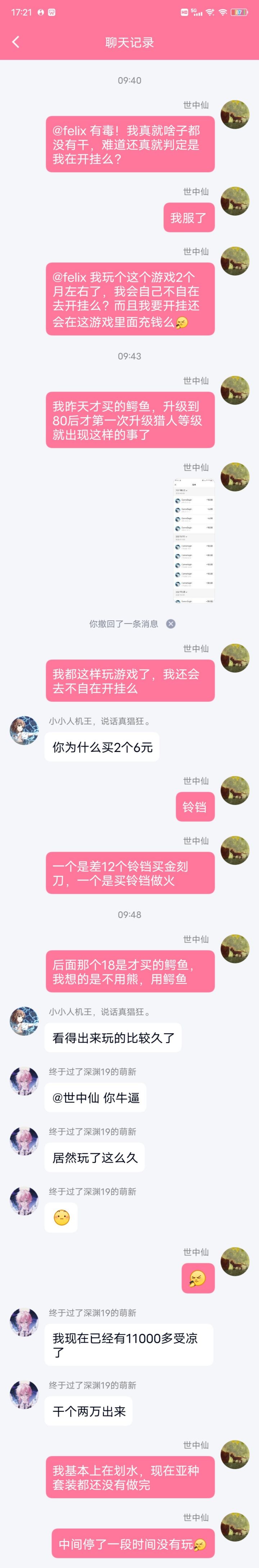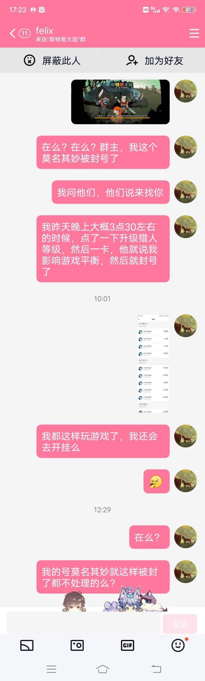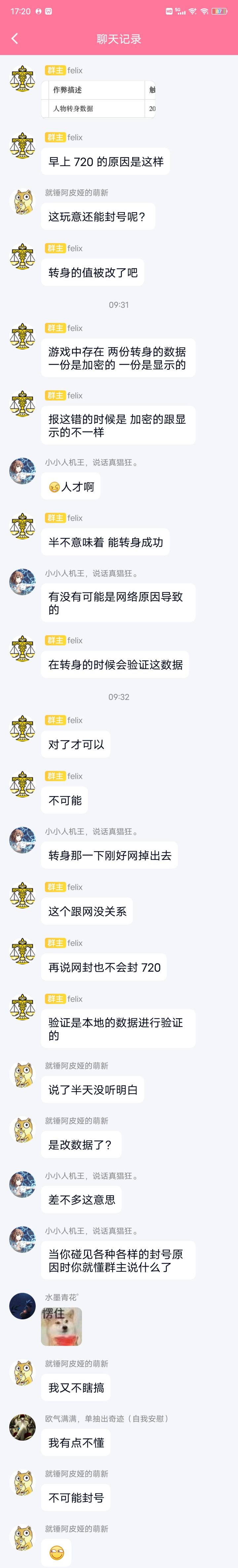 然后,我看到TapTap上面有人说这种去找群主可以找他帮解封,然后我就去群里面找群主,他早上8点左右说的我被封的原因是修改了转身的数据,也不给我解封???你搁这逗我玩呢?我拿命去修改转身数据?我tm要开挂不早开?非要等到我充了钱再开?我要开挂不拿个小号开?我非要拿我充了钱的号开?我另外的人物都是满的猎人等级的,我买个新人物升个等级还需要改数据?真的是有毒!