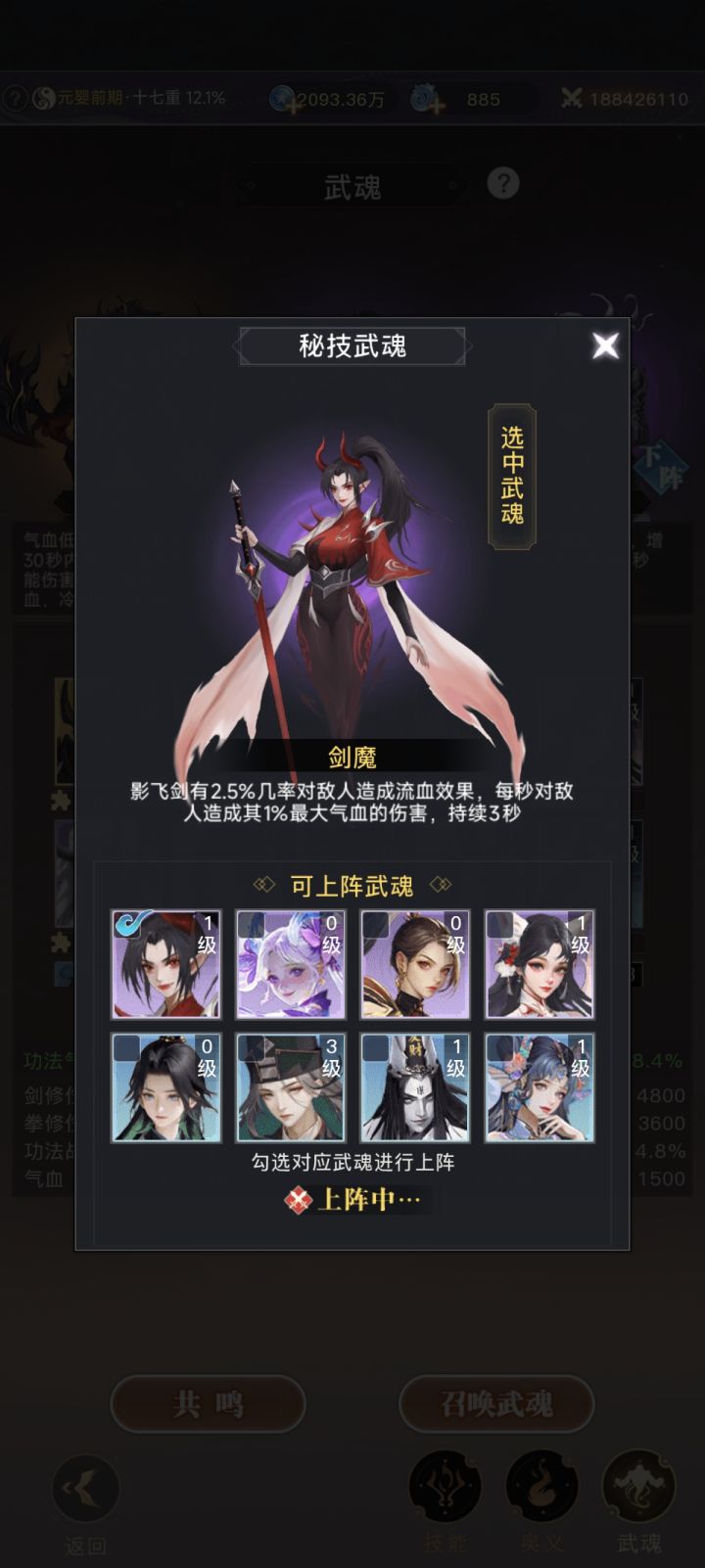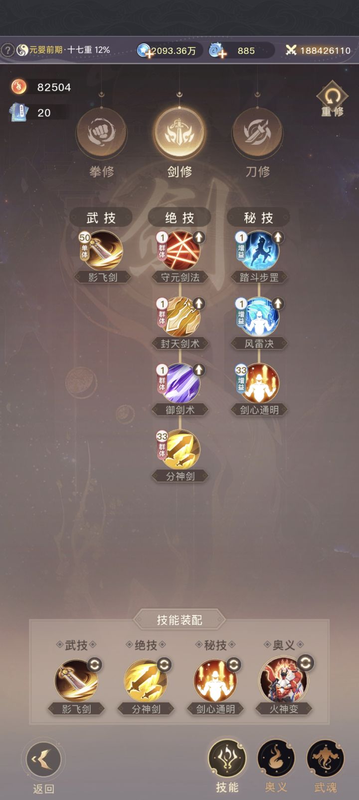 影分剑加分神剑加剑心通明,奥义自选。我的话喜欢这个火神变身,刷起图来很爽。武魂没有金的可以用这个剑魔,配合分神剑,流血伤害很高。#大武道攻略 #大武道