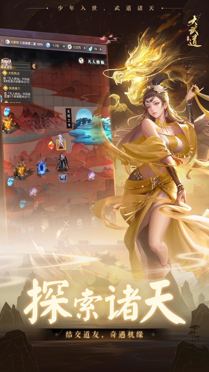 #大武道攻略 1.境界提升丹药前40次一定要吃金色的,不够丹炉可以低品质合成高的,灵草不够试炼爬塔1.1.另外丹药没有服用次数限制,超过40次还可以吃,境界差一点提升上去可以吃,注意!!!这时候不要合成成高阶的了。1.2.境界突破修炼速度很重要,淬体液看到就买。淬体丹田那里提升速度,重力市可以拿材料,技能升级材料不拿,一定点击双倍。仙友解锁后每天修炼,注意!!魅力可以到武道大厅里面兑换,注颜