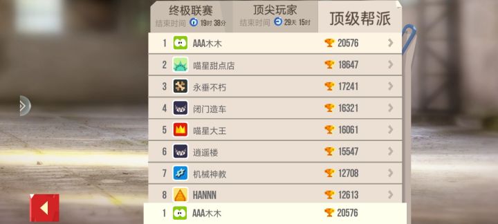 感觉帮派里成员有些不是很积极,加入当天过后就没打过了,打算清理一波。帮派战,城市战都要积极参加图2帮派战奖杯破记录5.5k个图3 我终极车,数据太拉了,但是勉强能打(0氪)图5国际服锦标赛主车客串是国际服哦#喵星大作战