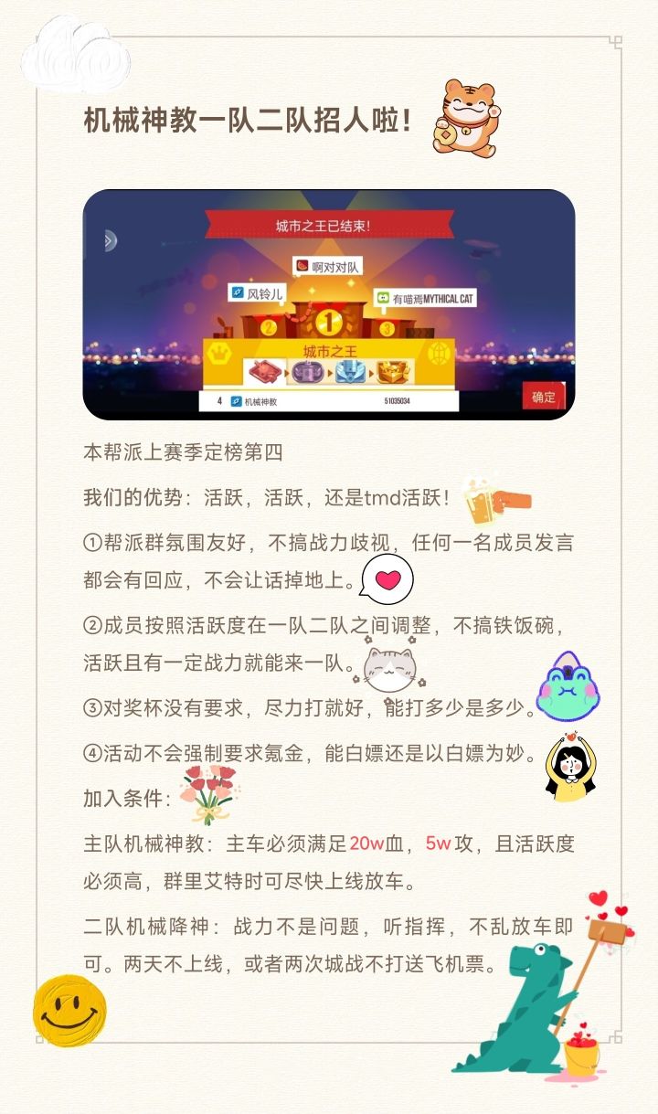 只要终极战车好,威名任意,积极打帮派战,积极参与城市之王🏙;群内成员讨论积极;活动不会,大佬指导;包你终极装备拿到爽🐱