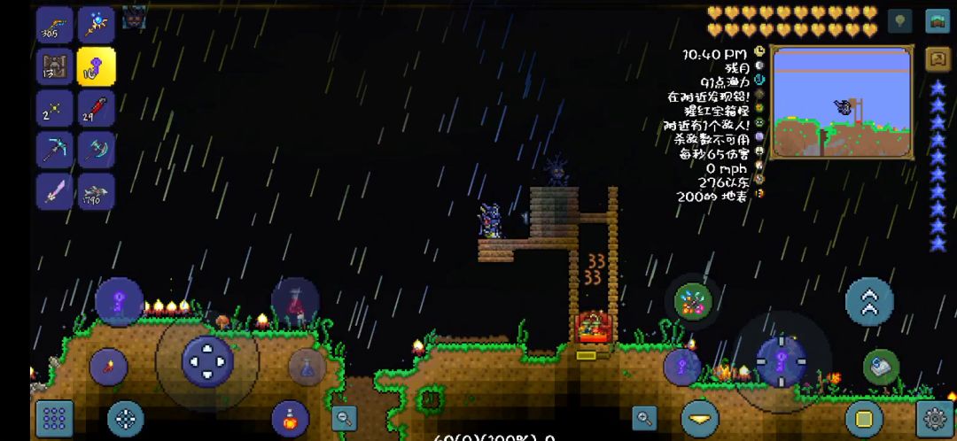 首先说明,此方法是受到b站视频的启发并且进行了修改,不知道是否有大佬早就使用了这种方法b站链接:https://b23.tv/rq6zHk在视频中,宝箱在放入钥匙转变为大宝箱怪时,会自动落下平台,掉入预先铺好的岩浆,我试了好多次,完全落不下去,不论单人模式多人模式一次也没成功,那么是否可以转变个思路,手动让它落下去,而且还不会吸引仇恨,所以我想到了这个,由于截图时间是游戏里的晚上,不是很清楚