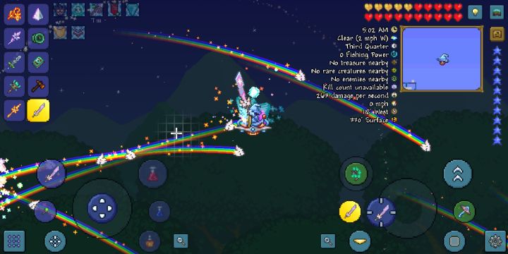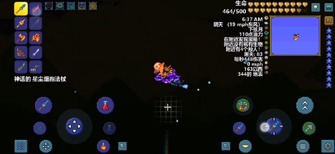 好久没把我肉钱拿到的黄金鱼竿弄出来了~今天钓鱼的时候突然日食了实际上这是我很早就摸索出来的一个办法此方法适用于战士,需要喵星人之剑,还需要一个UFO喵星人之剑的剑气特性是反弹,我们可以在空中坐着UFO,一直往下射剑气。你们可以看到我右边的怪物击杀栏一直在刷新,DPS甚至一度高达1400多对了,不要像我那样跑到空岛高度,那样子会刷飞龙和鹰身女妖很烦