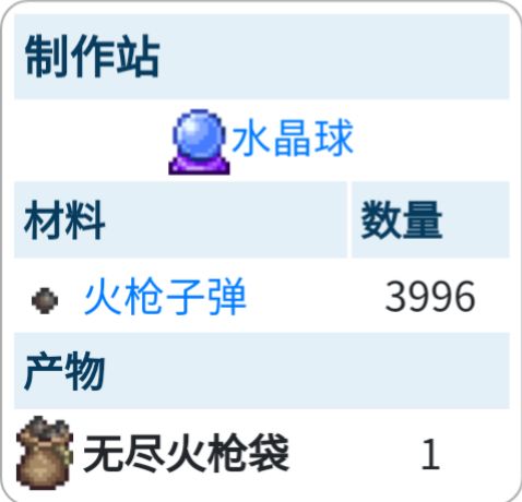 (隔壁精华)无尽火枪袋是一种作为弹药类的物品, 它可以放在玩家物品栏中的弹药格中.它在玩家的物品栏中时会被认为是不会耗尽的火枪子弹。具有独特攻击方式的枪会正常、无限期发射,并保留它们的特殊攻击例如乌兹冲锋枪可以依然正常使用它“为火枪子弹和银弹加速”的功能。制作无尽火枪袋需要4满组火枪子弹,每组999个。使用无尽火枪袋时,节省弹药效果可以正常生效。但这可是“无尽”火枪袋,弹药什么的完全不