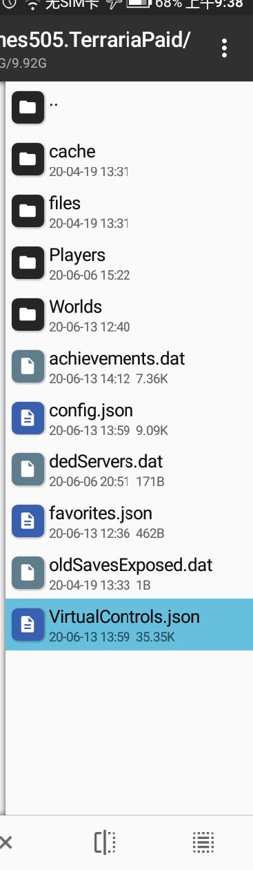 当你换手机或朋友想要你的键位时,这个帖子就体现到作用了!文件管理到Android-data-com.and.games505.TerrariaPaid你就会看到这样一个文件-VirtualControls.json。这个就是键位数据的文件啦!把他发给朋友然后放在上面说到的文件路径中去。你还可以直接在这个文件里改键位但🌚🌚🌝🌝。