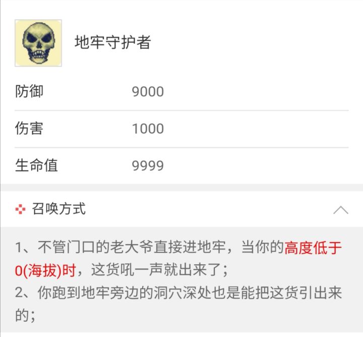 关于地牢守卫或许你可能不太了解,当然如果打门口的老头(肉山前的骷髅王)就可以避免下地牢出现地牢守护者……但是今天我们就得打打这个地牢守卫。首先看地牢守卫的属性他的防御是9000,目前泰拉里没有任何物器破的了他的防。攻击也很高直接秒杀玩家。属于一碰到就死的那种。下面上打法。首先创建一个新世界,把空中的世界树等一些碍事的挖掉。(规划好逃跑路线)然后就是跑到地牢哪铺设传送器如下图待会引出地牢
