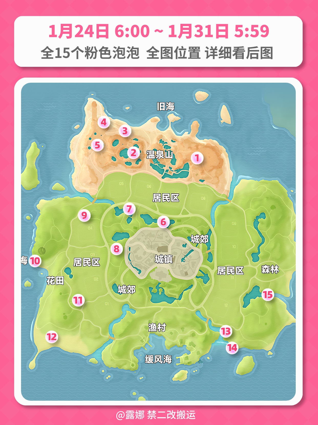 规则 1、每周每人可拿1次 2、每周六早6点刷新,1月31日 早5点59分刷新位置 3、每个人的粉泡内含的物品不同 4、粉泡内的物品随机:粉色卫浴家具(非必出),满愿星萤石溜溜木等 ALL Pink bubbles Locations Guide Locations will reset at 5:59AM Jan 31 (UTC+8) #心动小镇 #心动小镇攻略 #发现好游戏 #heartop