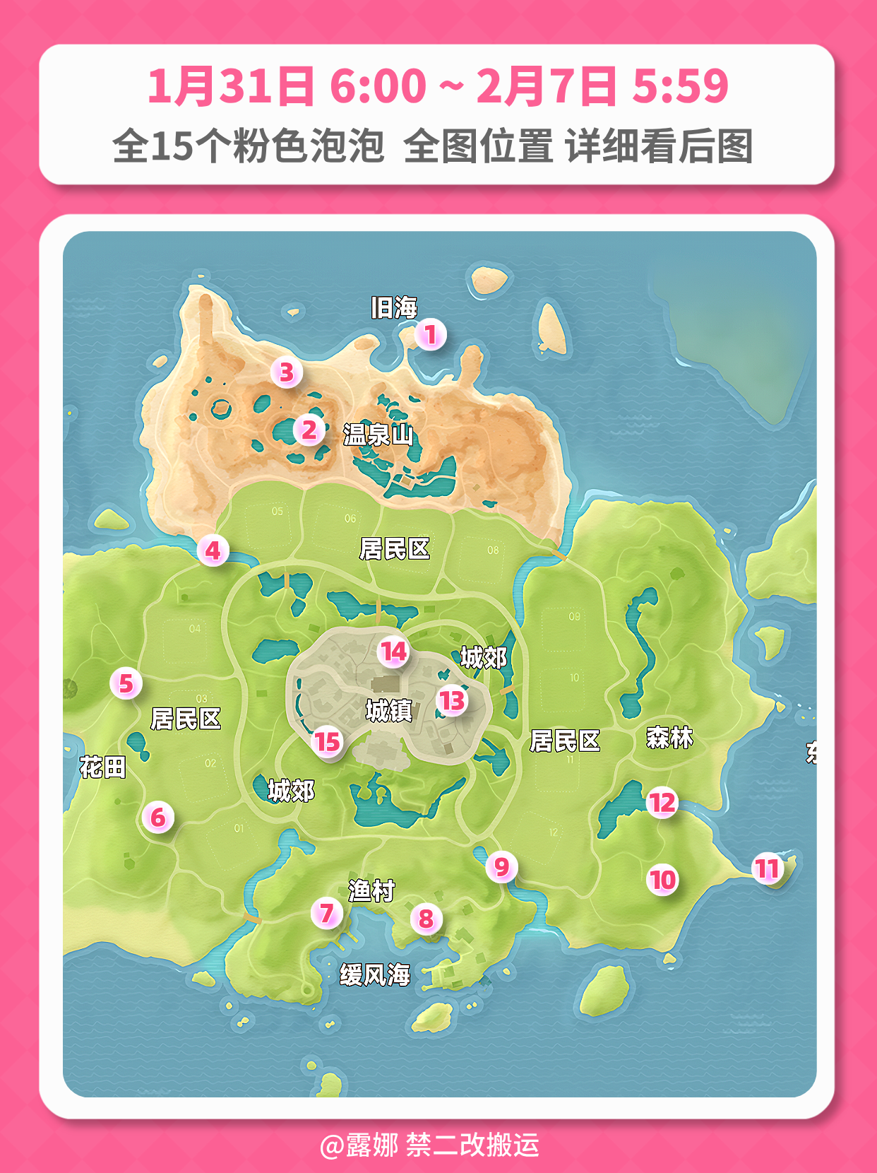 粉色泡泡规则1、每周每人可拿1次2、每周六早6点刷新,2月7日 早5点59分换位置3、每人的粉泡内所含物品不同4、粉泡内物品随机:粉色卫浴家具(非必出),满愿星等ALL Pink bubbles Locations GuideLocations will reset at 5:59AM 7th Feb (UTC+8)#心动小镇 #心动小镇攻略 #发现好游戏 #heartopia