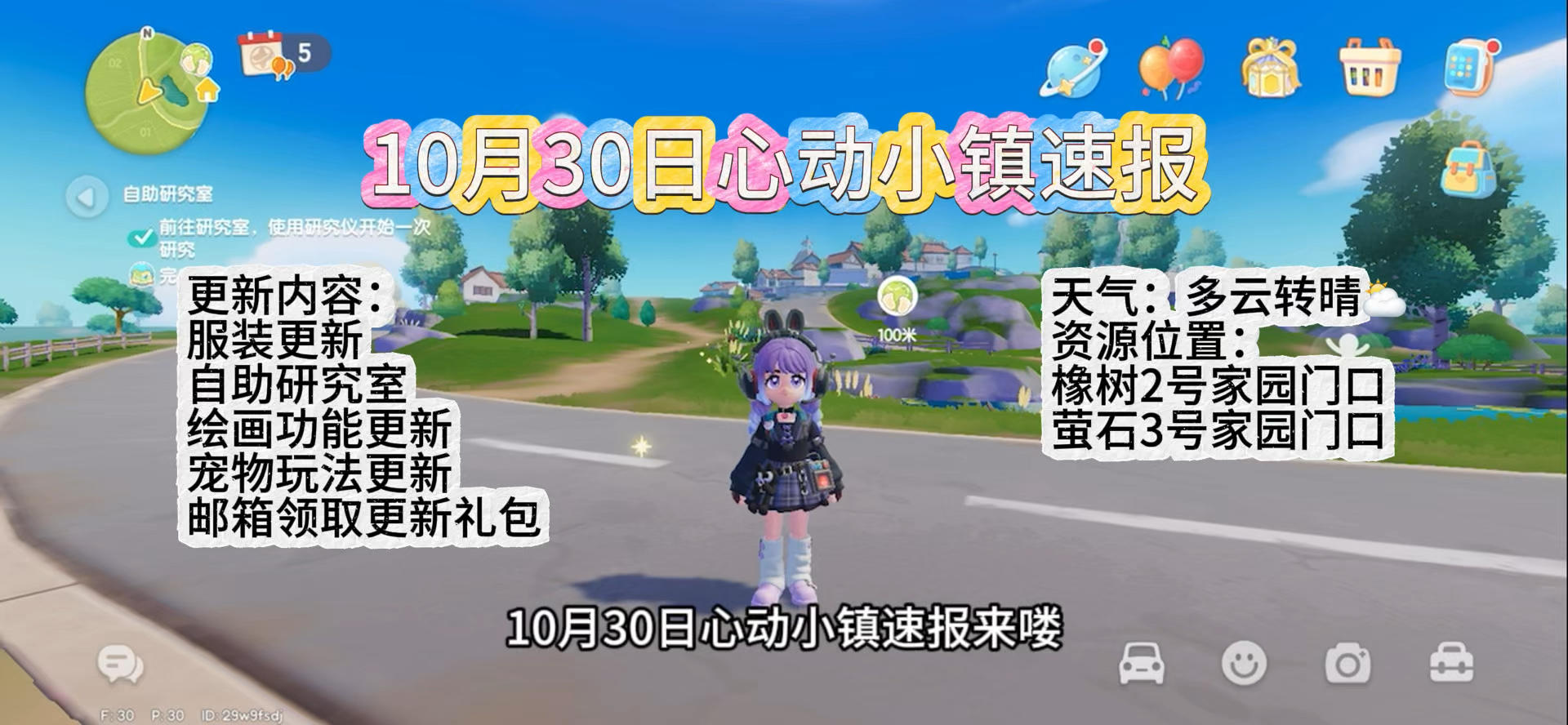 【今日小镇更新必做】 1、接听阿塔拉电话开启自助研究室玩法 2、购买多罗茜商店上新服装发型 3、体验绘画功能优化增加新图案和家具 4、体验宠物互动玩法升级优化 5、邮箱领取更新礼包🎁300月光水晶、8000金币、10满愿星 【天气】 多云转晴⛅️ 【资源位置】 橡树2号家园门口 萤石3号家园门口 #心动小镇攻略 #心动小镇 #心动小镇创作家激励计划 #游戏日常 #心动小镇攻略征集 #心动小镇创作家