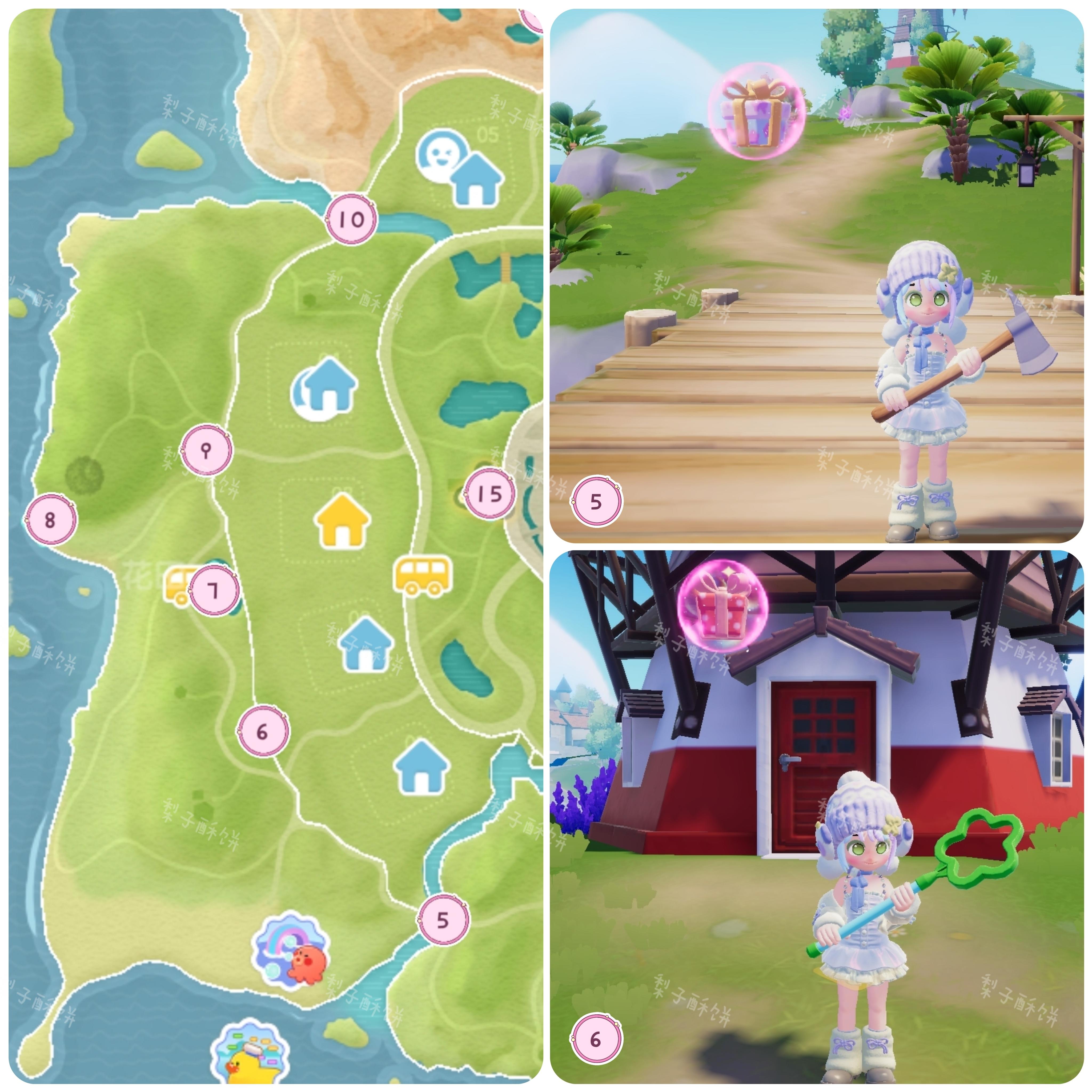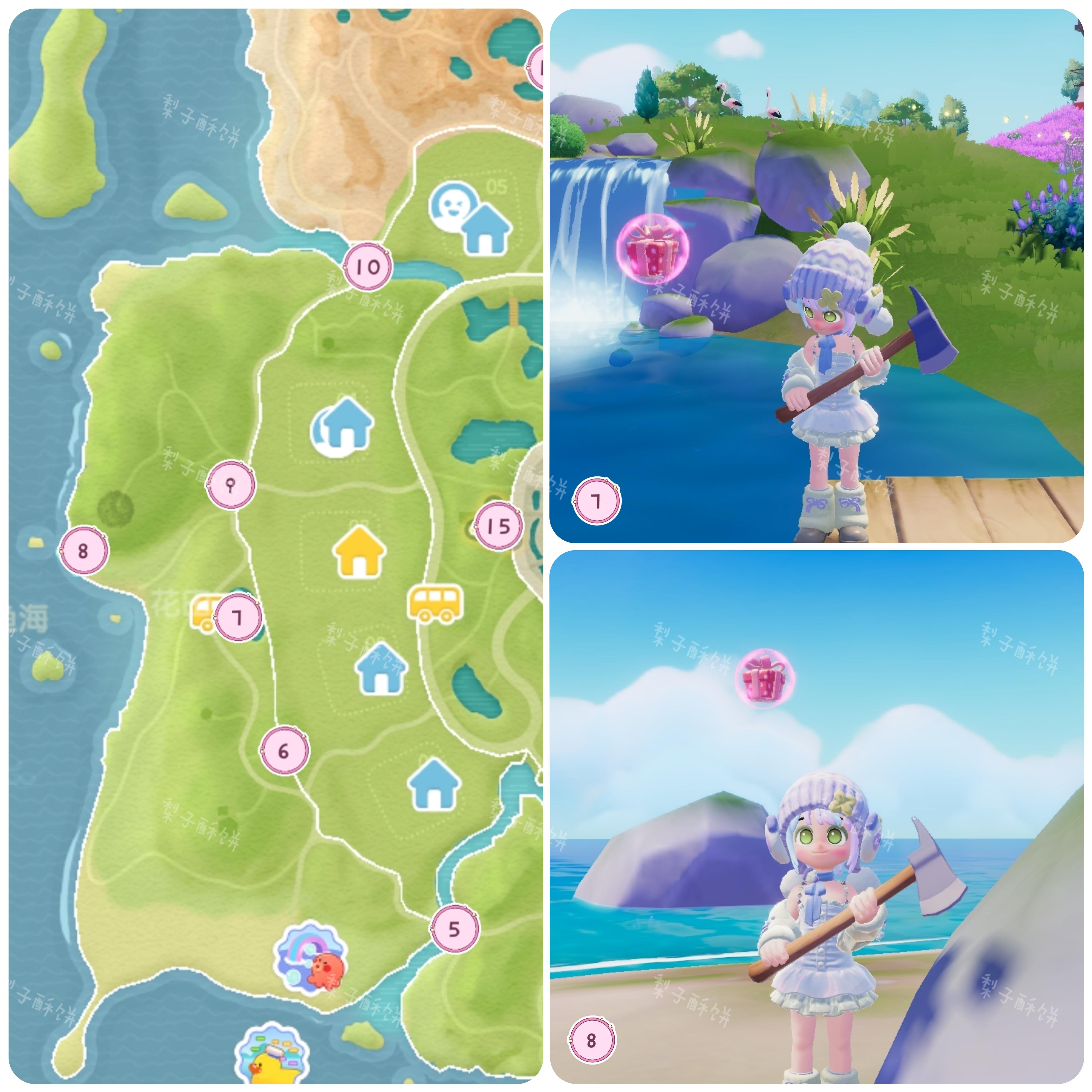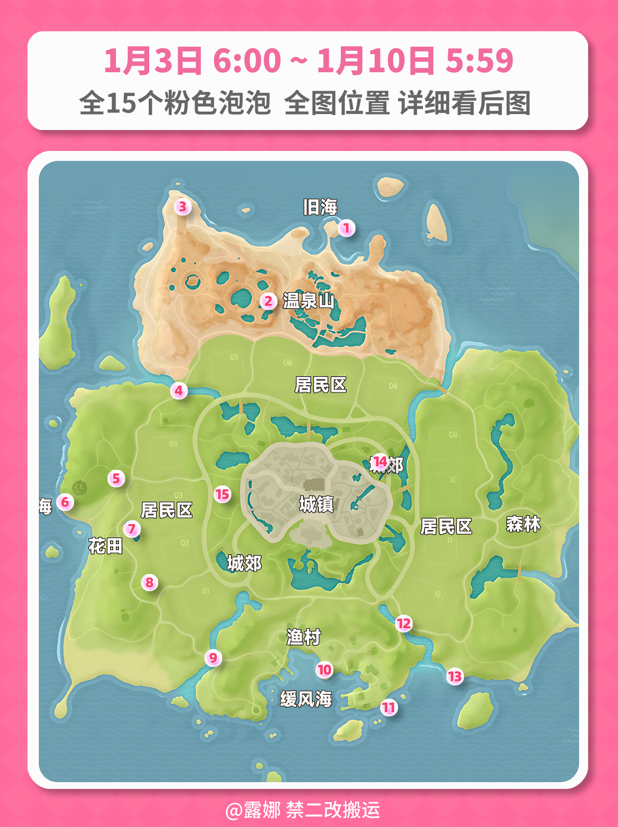 全15个粉色泡泡位置详见视频 粉色泡泡每周六早6点更新每周可拿1次 随机开出:满愿星、粉卫浴四件套、其他道具资源等 每个人的泡泡内物品都不一样哦 #心动小镇 #心动小镇攻略