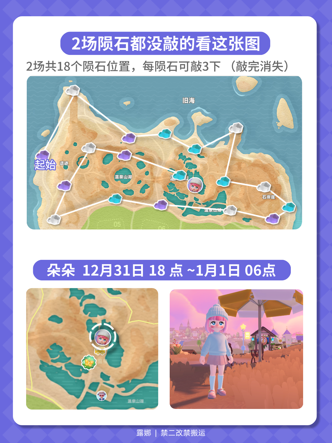 第二场 全9个陨石位置详细见图 陨石会刷新2次 12月31日晚18点刷新9个 12月31日24点(1月1日0点)刷新另外9个 朵朵位置 温泉山巴士站遮阳伞旁 朵朵存在 12月31日晚18点~1月1日早6点 #心动小镇 #心动小镇攻略