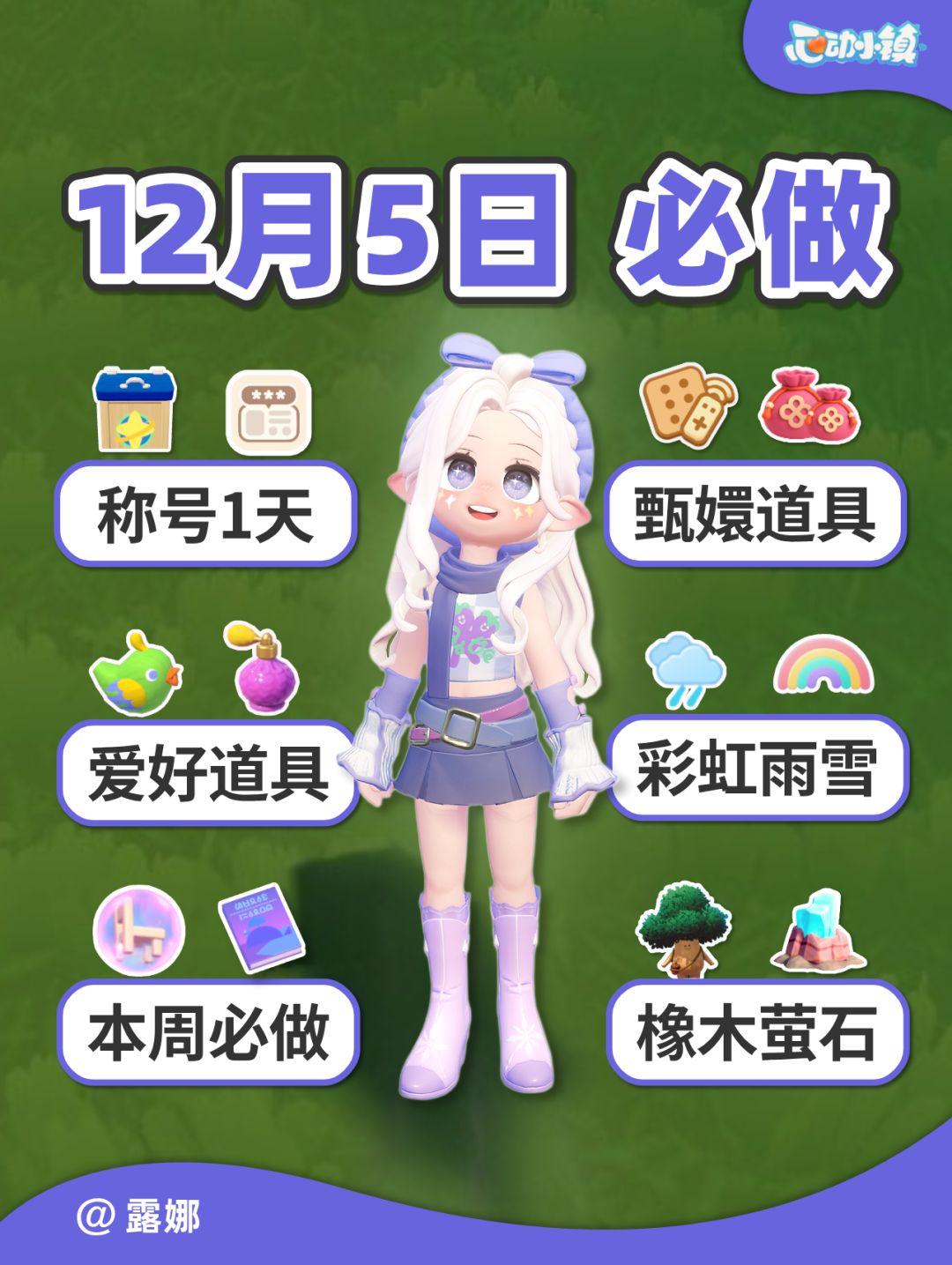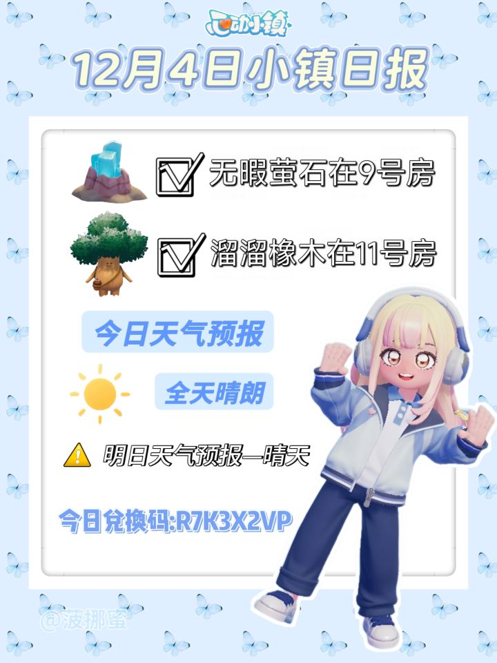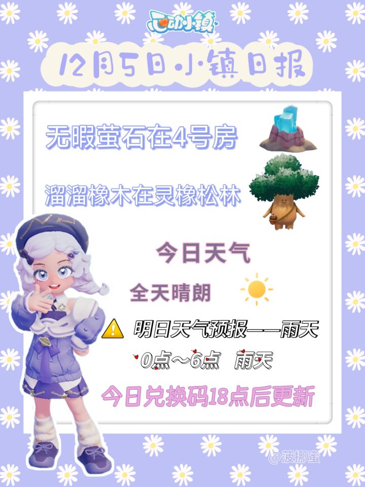 【天气预告】 今日小镇全天晴朗🌞 明日0:00-6:00有雨雪☔️❄️ 【雨天必做】 文艺街找朵朵 拍五星鸟 温馨提醒:粉色泡泡位置明天6点后更新,在此之前可参考周一视频收集。 【资源位置】 萤石:4号家园门口 橡树:灵橡松林 #心动小镇 #心动小镇攻略 #心动小镇甄嬛传联动 #心动小镇创作家激励计划