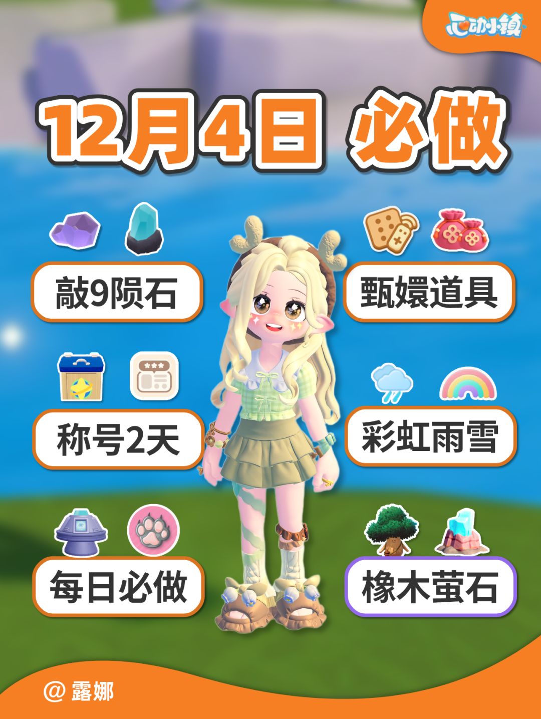 溜溜木11 萤石9 《桑拿》称号没拿的注意哦! 陨石没敲的还可以敲,推测消失时间在18点或24点 #心动小镇 #心动小镇攻略
