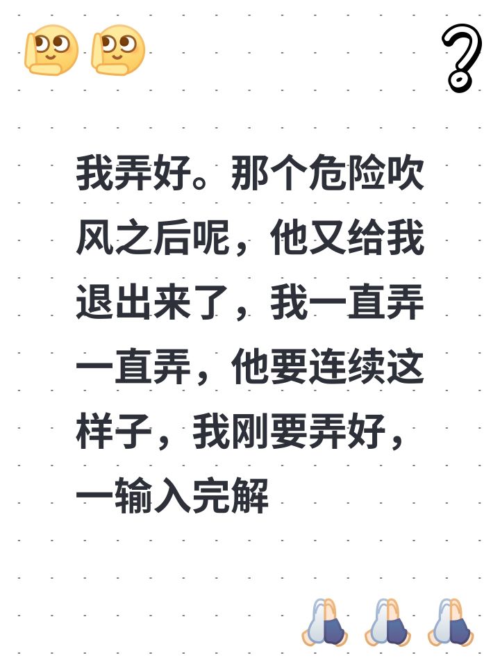 我弄好。那个危险吹风之后呢,他又给我退出来了,我一直弄一直弄,他要连续这样子,我刚要弄好,一输入完解