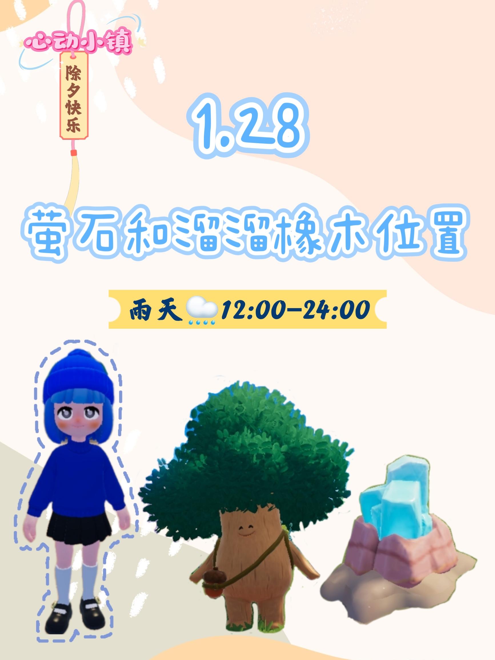萤石:位于04号房门前溜溜橡木:位于灵橡松林灯彩结良宵No.1圆月照玉阶:位于中心广场正面右侧灌木丛中(可获得豆沙汤圆食谱)No.2车马喧嚣处:位于安德鲁背后的牌坊处环绕(可得满愿星)No.3灯彩照三潭:位于09号房门前的小牌坊(可得糖葫芦手持物)No.4林深塔顶月:位于森林小鹿塔顶(可得满愿星)雨天:12点-24点雨天朵朵:位于音乐阶梯喷泉旁的小平台#心动小镇