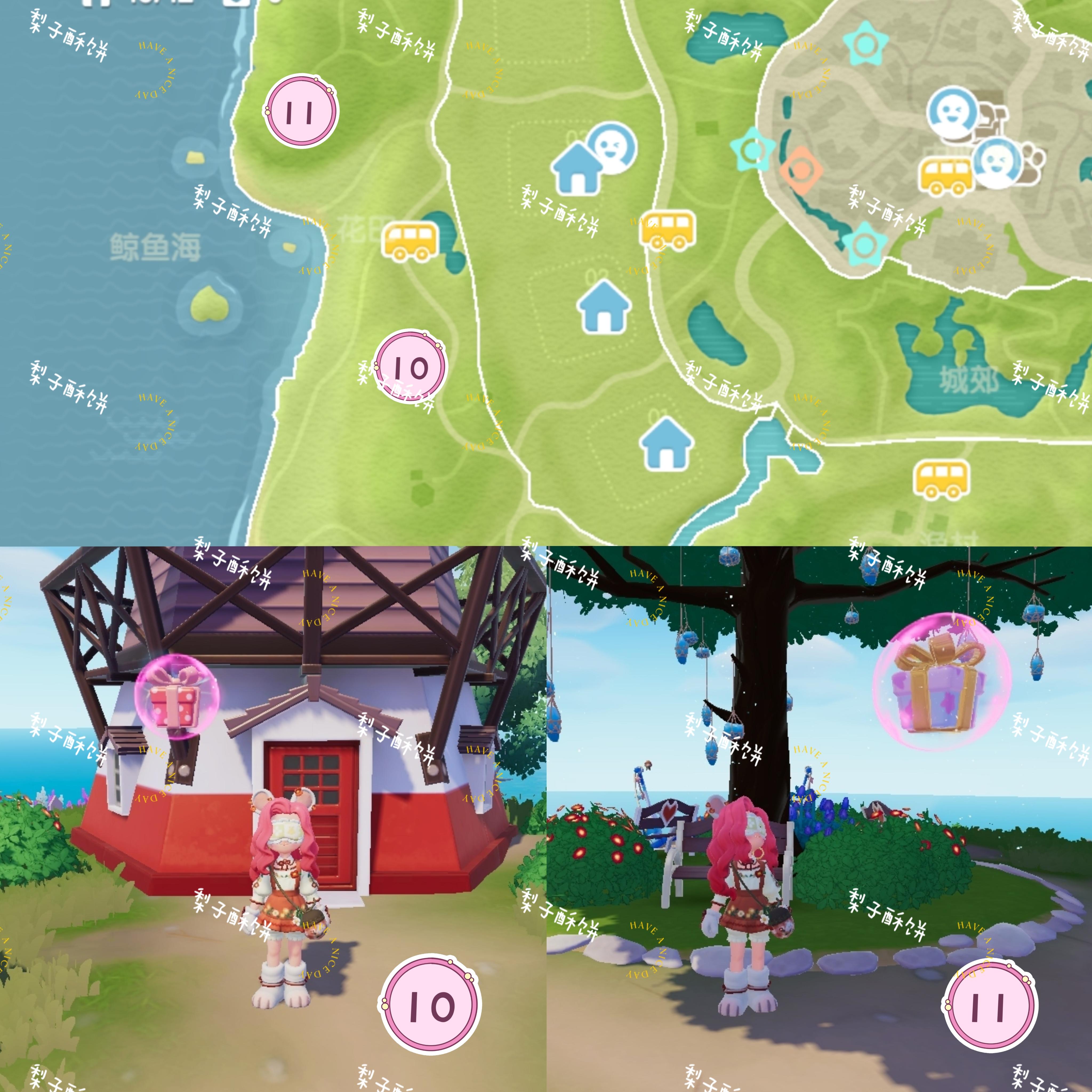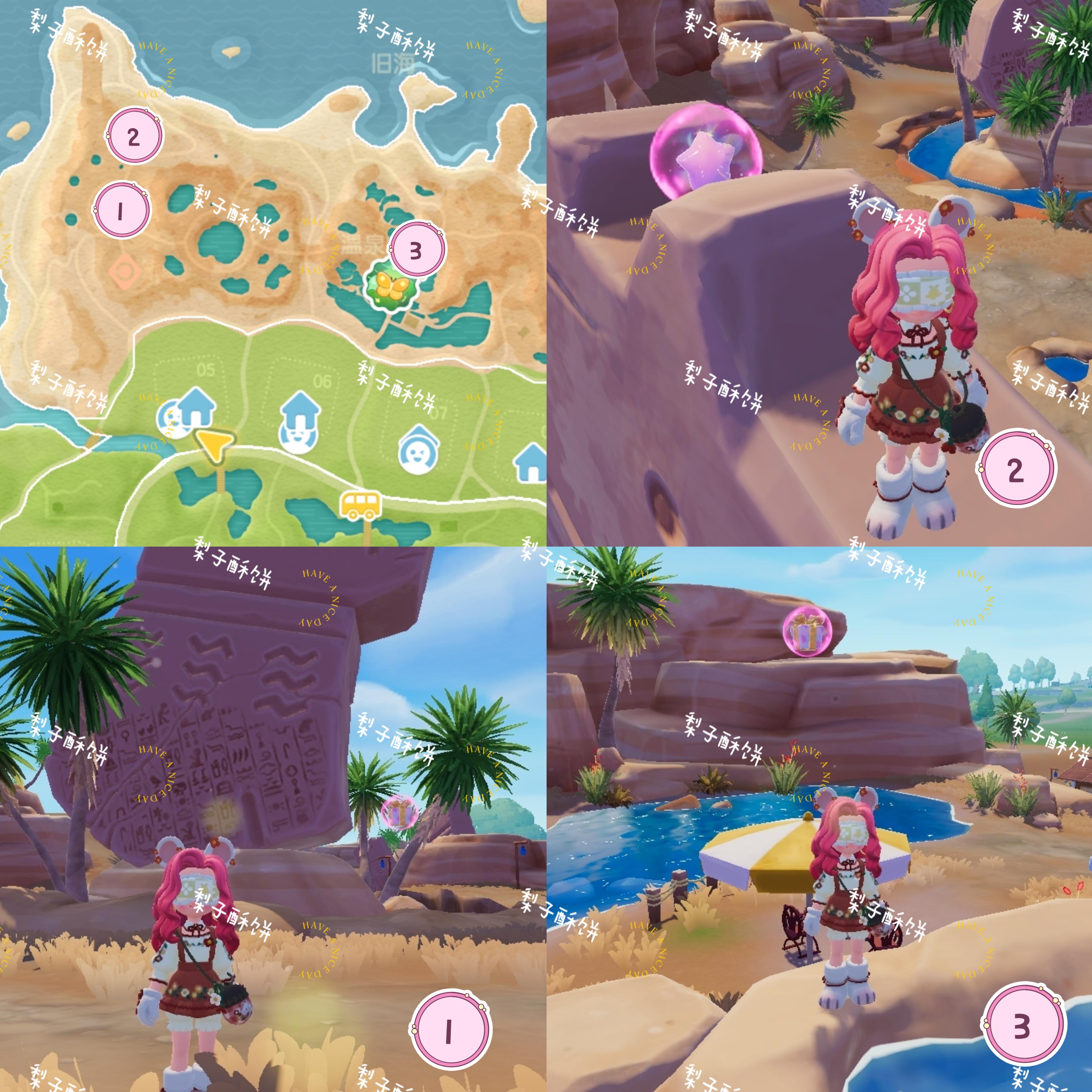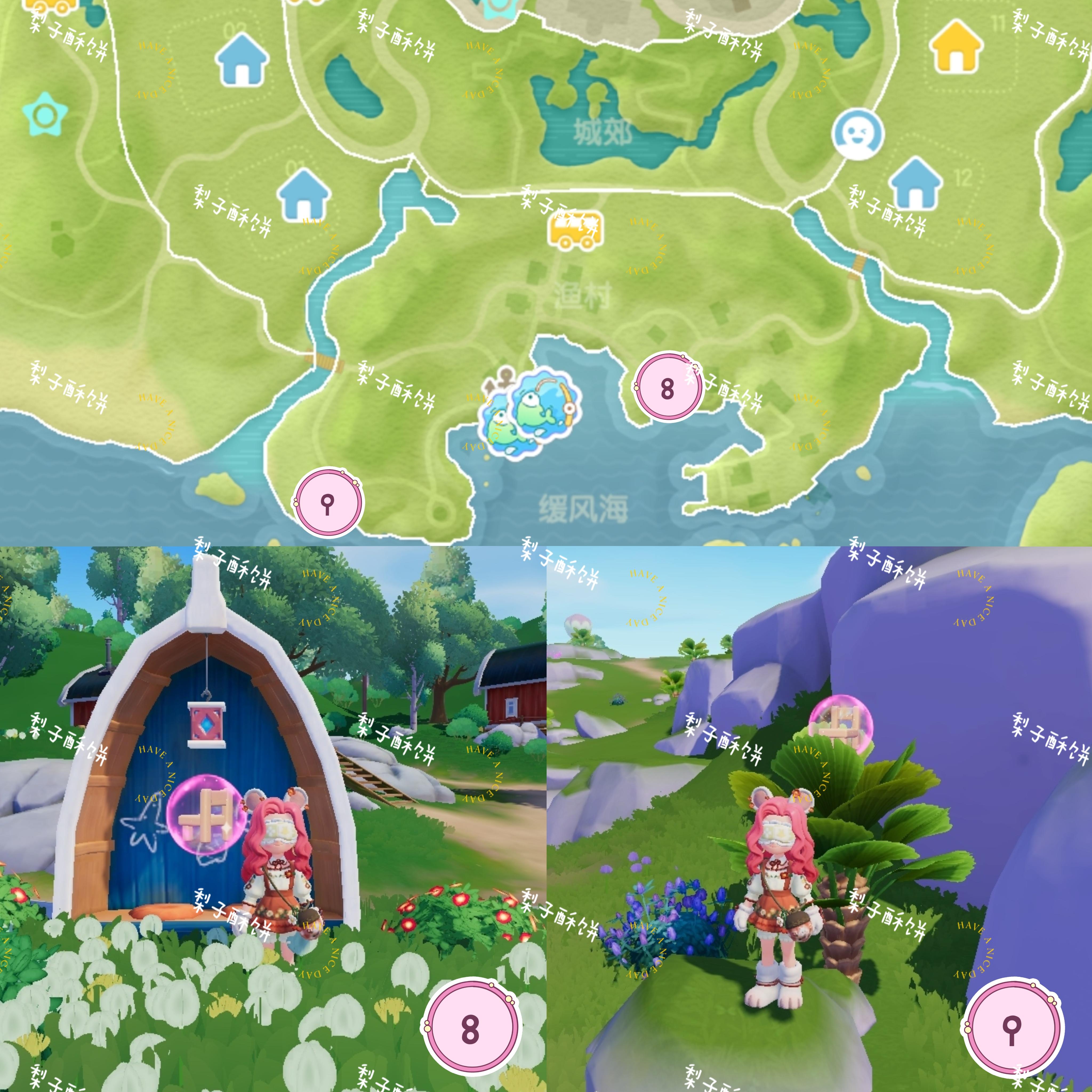 温泉山:遗迹中心 遗迹旁卡皮巴拉头上 温泉山公交车站旁黄伞上森林:浅水河桥上 森林靠海的帐篷里 前往森林岛的桥上 跳跳台上渔村:直立船处 威尔靠海旁的树上花田:弗妮一侧第二座风车处 鲸鱼山许愿树 花田靠近霞光河靠海处中心城镇:中央广场右侧绿色遮阳伞上 收藏家院子里 卡清对面房子连接处 雨天:12:00-24:00雨天朵朵:位于文艺街喷泉旁边的小平台 萤石:位于01号房门前溜溜橡