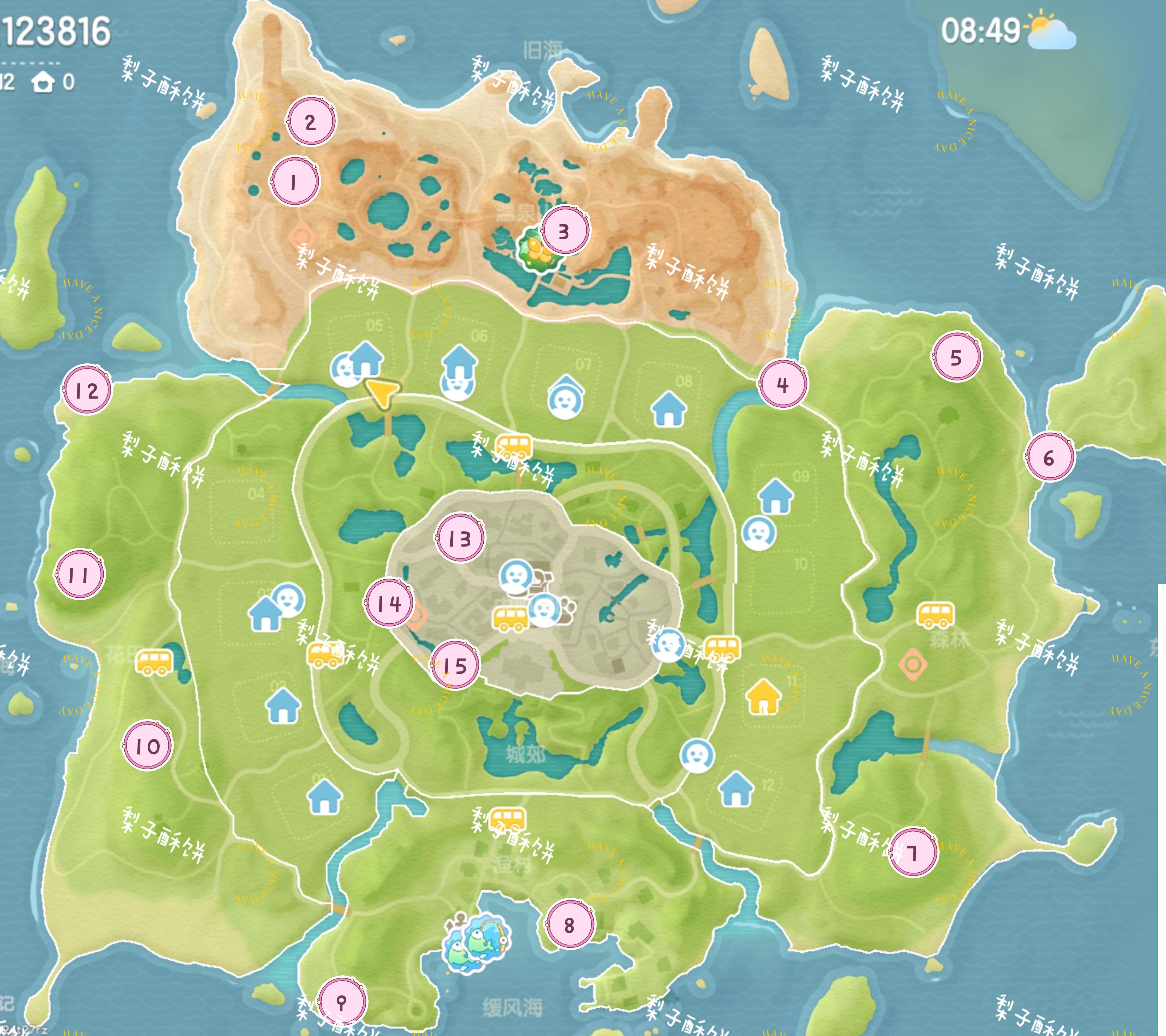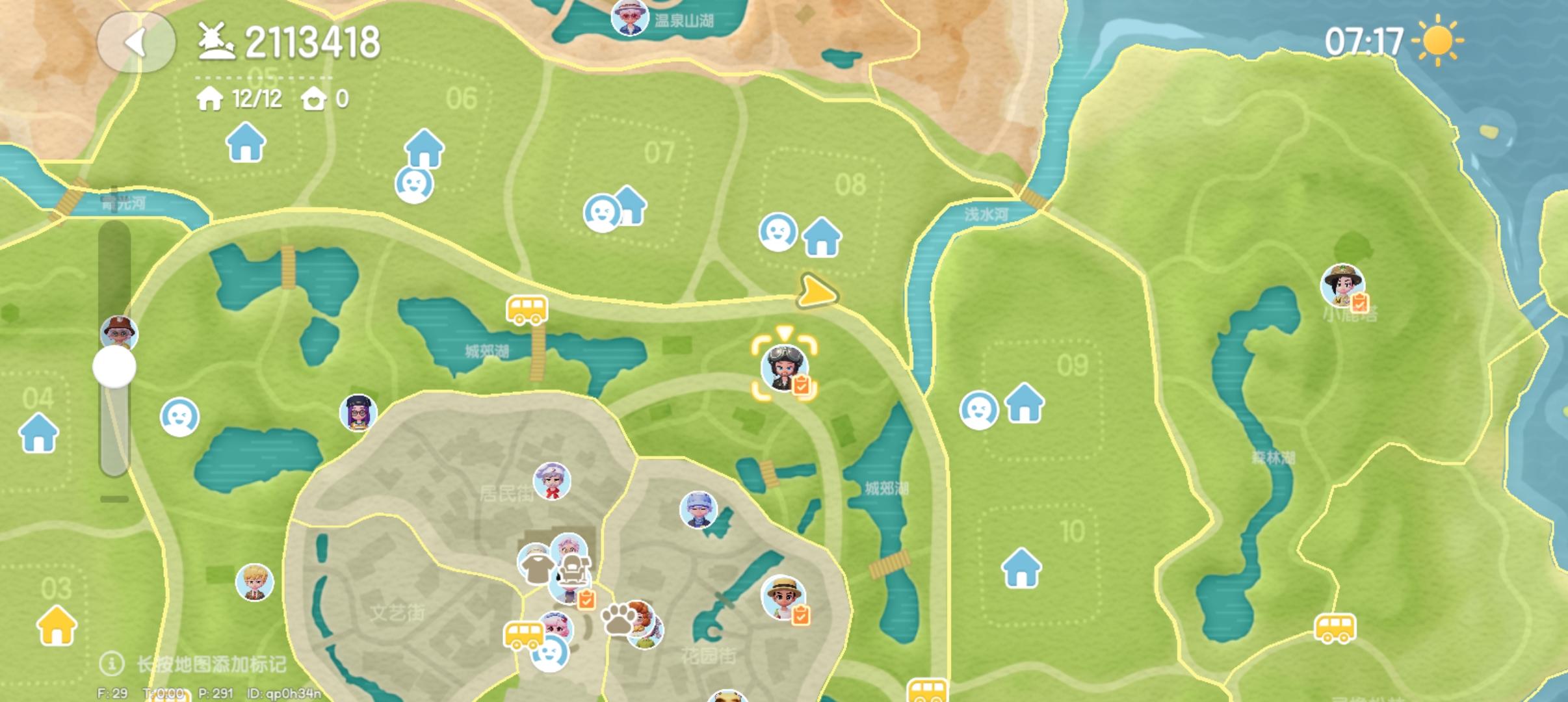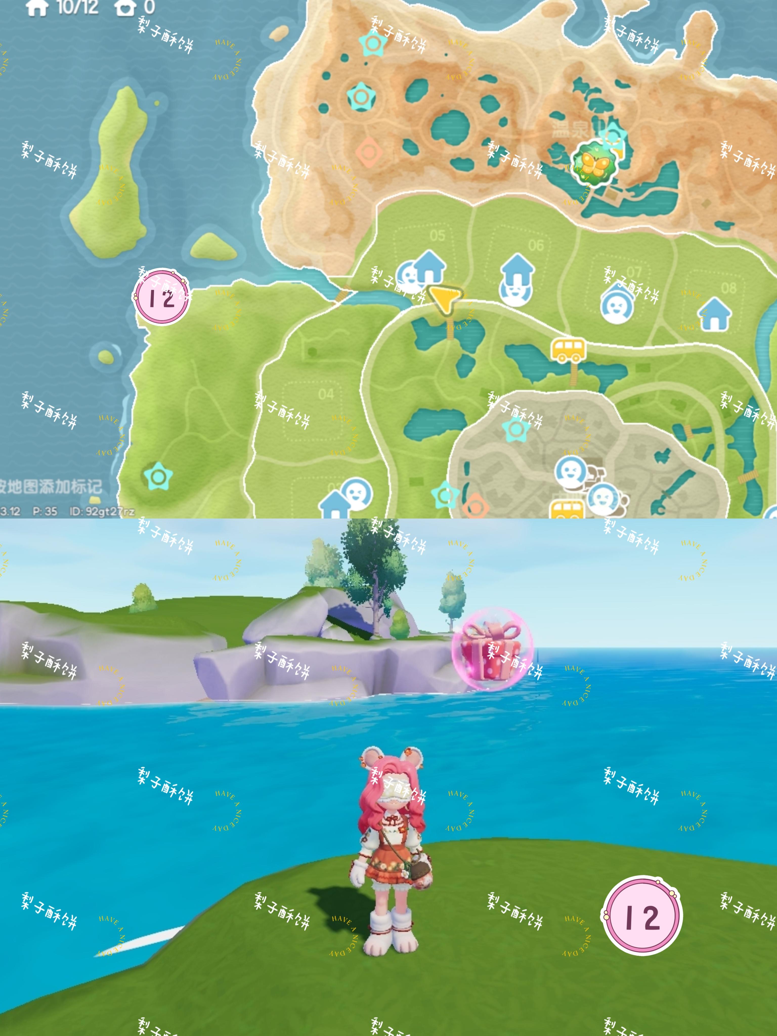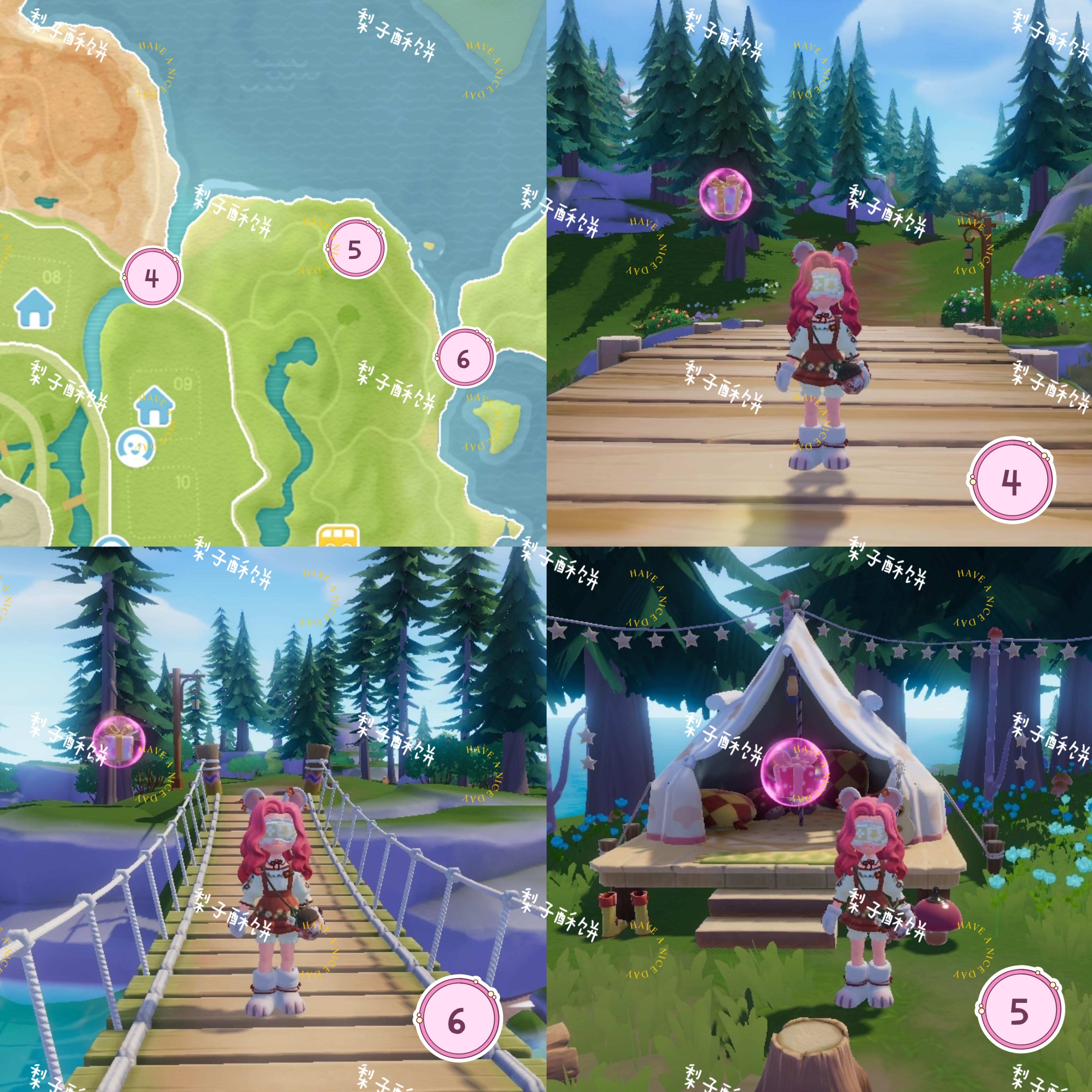 温泉山:遗迹中心 遗迹旁卡皮巴拉头上 温泉山公交车站旁黄伞上森林:浅水河桥上 森林靠海的帐篷里 前往森林岛的桥上 跳跳台上渔村:直立船处 威尔靠海旁的树上花田:弗妮一侧第二座风车处 鲸鱼山许愿树 花田靠近霞光河靠海处中心城镇:中央广场右侧绿色遮阳伞上 收藏家院子里 卡清对面房子连接处 雨天:12:00-24:00雨天朵朵:位于文艺街喷泉旁边的小平台 萤石:位于01号房门前溜溜橡