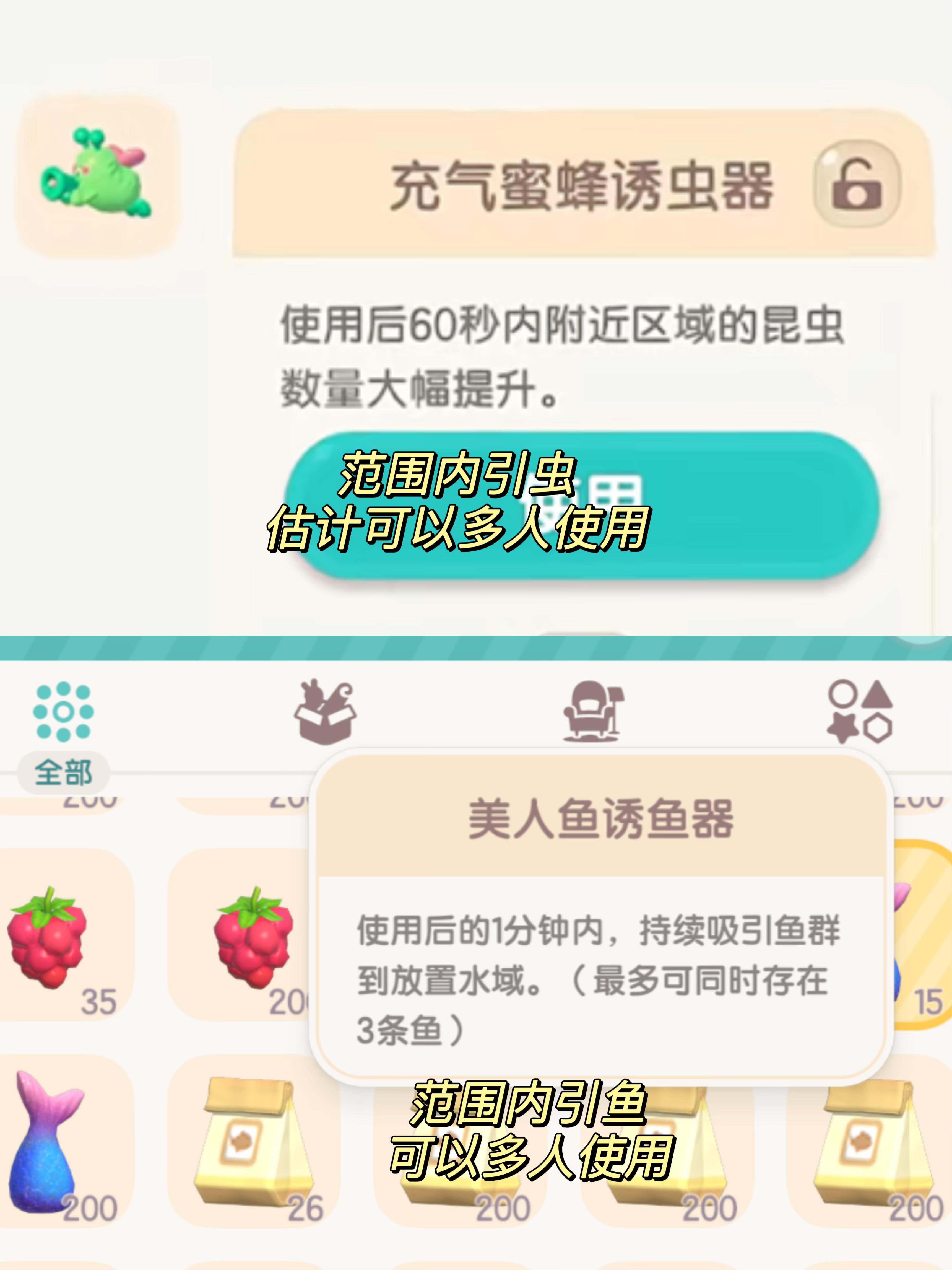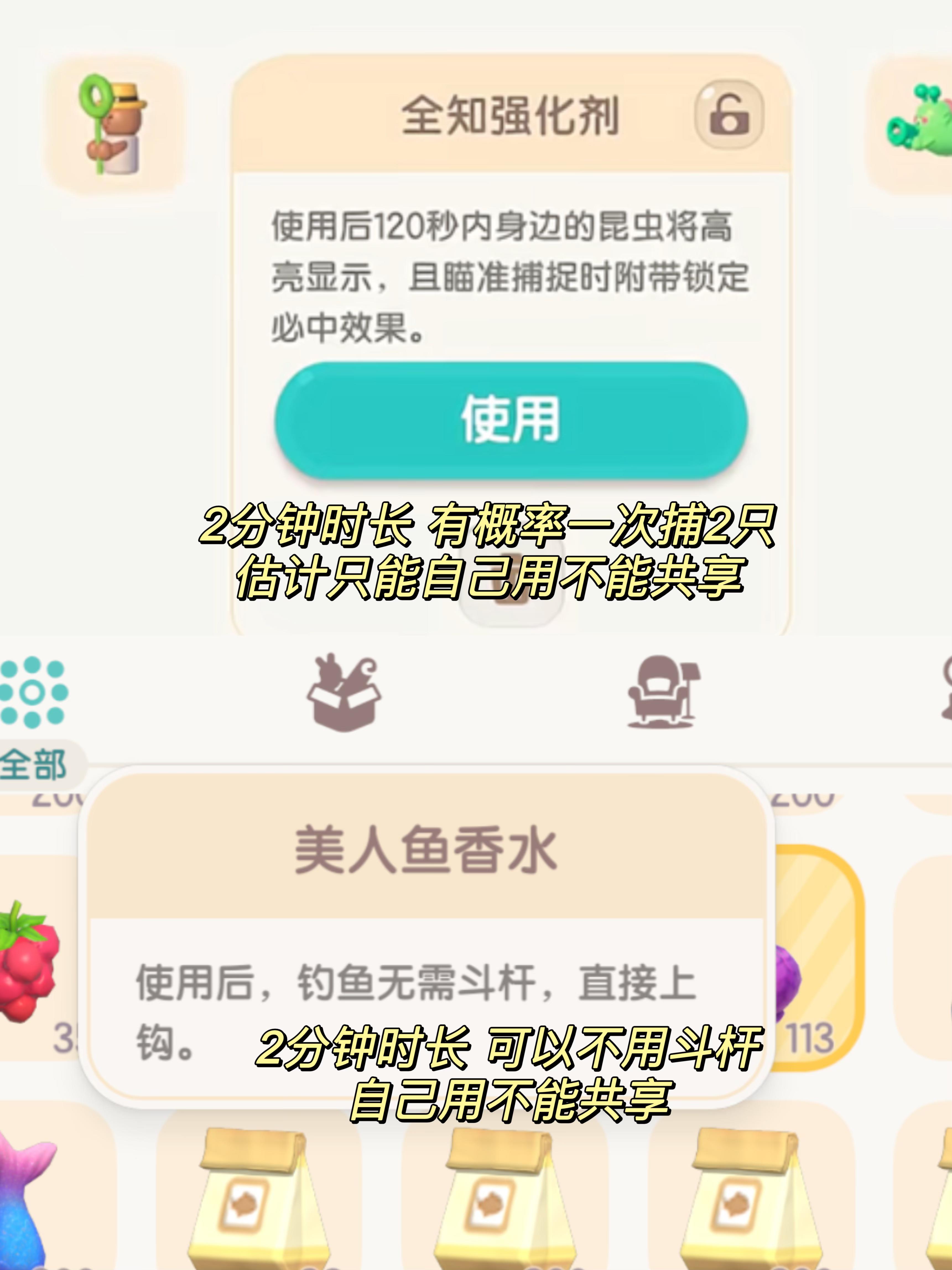 道具要更新了虫佬有属于他们的美人鱼香水和鱼尾了我估计强化剂还是只能自己用,抓虫效率会提升蜜蜂诱饵会和鱼尾一样可以共享,这点挺重要的,后面可以一起刷更多特殊天气,特殊条件虫了 #心动小镇 #心动小镇线条小狗联动