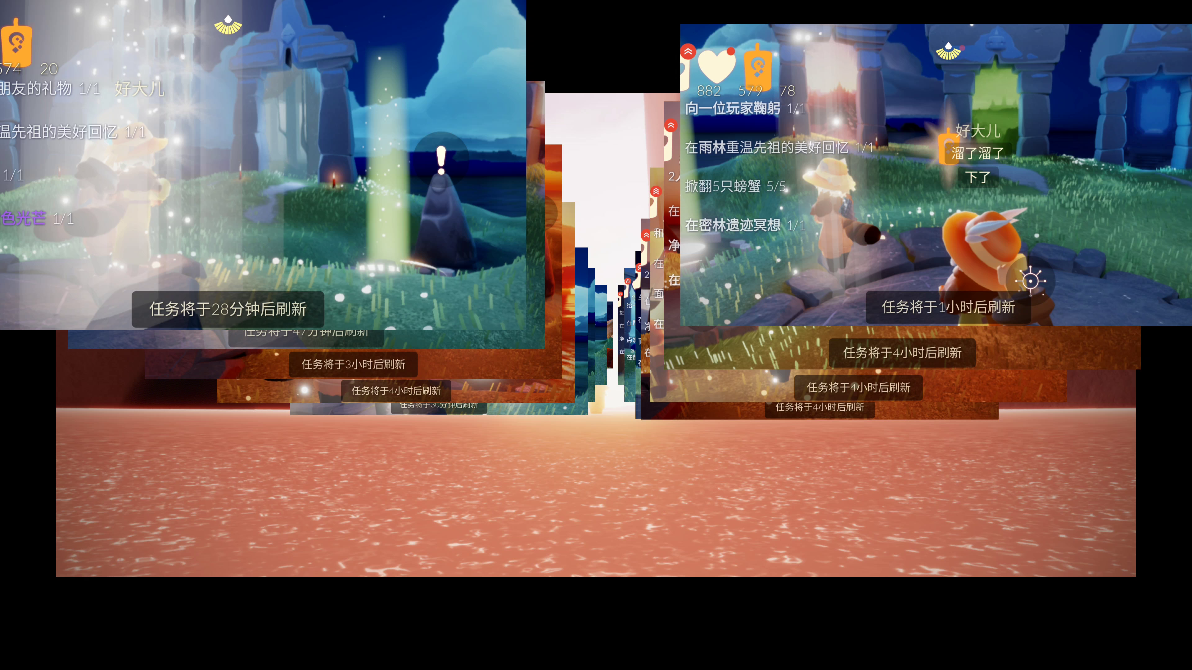 转自微博:今天游离翻车了吗① 今日季节蜡烛(暮土)② 今日任务详解③ 今日大蜡烛点(雨林暮土禁阁)④ 预估落石点(图示位置中随机出现一个)⑤ 海洋节相关物品价格=『每日任务』=「清理圣岛被污染的漩涡」流程比较复杂直接看图「在暮土重温先祖的美好回忆」暮土一龙图,中心圆台左下方空间内「点燃20根蜡烛」「在巨兽荒原冥想」在暮土四龙图出口门右边平台石碑前光圈处打坐并留言=『落石点』=