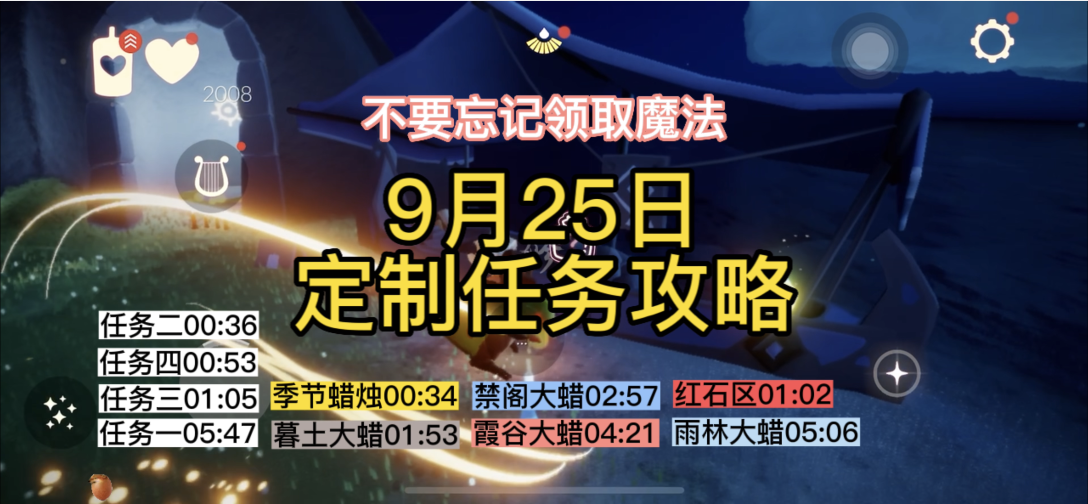 2022.9.25每日任务+季蜡+大蜡今日免费魔法:绚丽彩虹&体型重塑今天任务比较简单,算上红石一起快的话8分钟,慢的话10分钟大厅到平原拿完季蜡和先祖3分钟左边图单人烧红石2-3分钟烧完直接去浮石等光,运气好就快