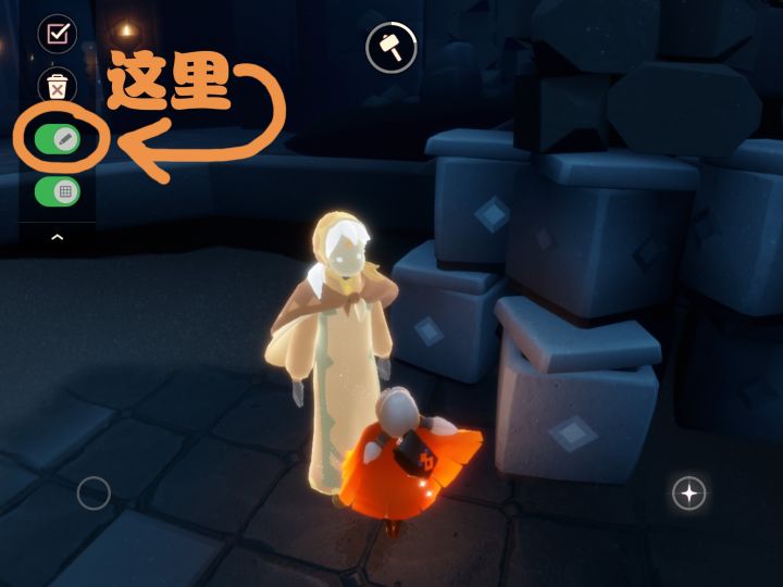 进入共享空间后,左上角垃圾桶下边有个笔的按钮,一般刚进去的时候都是开着的,即是绿色需要点一下,从编辑模式变为预览模式,然后画面就是这样啦,然后点这个按钮与先祖互动等先祖站定后记得再点回编辑模式哦,然后就可以摆物品啦