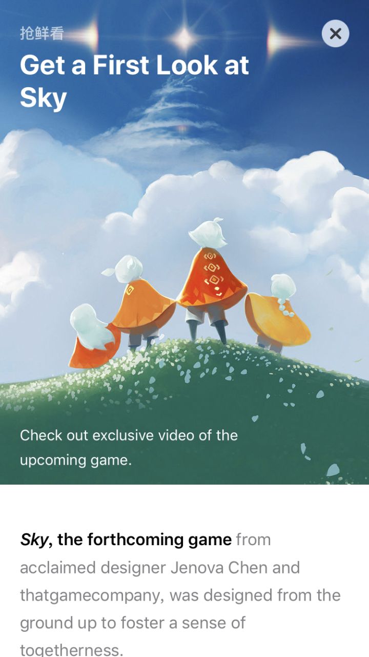 国际顶级游戏媒体IGN近日独家曝光了接近7分钟《Sky光遇》的前瞻内容视频。这款游戏的制作者——著名华人游戏设计师陈星汉作为旁白,专门为玩家们解读了《Sky光遇》别具一格的游戏玩法和匠心独运的设计理念。此外,苹果也在App Store发布了《Sky光遇》的编辑推荐内容,并且放出了几段游戏内的实景视频。素来以游戏中的清新风格和情感触动闻名的陈星汉,时隔五年带来的《Sky光遇》,演绎了一场在云中翱翔的