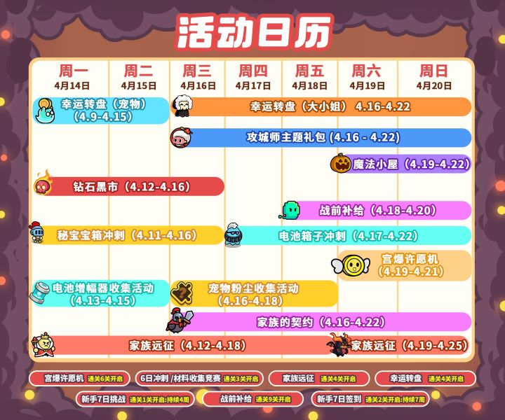 亲爱的宫爆家族成员们🌸第二期家族远征玩法已开启报名,还未报名的玩家记得速速前往报名参与哦~新鲜热乎的活动日历来耶!来看看本周的活动排期吧!📅 【活动播报-文字版】✅ 宫爆许愿机 4.19-4.21✅ 秘宝宝箱冲刺 4.11-4.16✅ 电池箱子冲刺 4.17-4.22✅ 电池增幅器收集活动 4.13-4.15✅ 宠物粉尘收集活动 4.16-4.18✅ 家族的契约 4.16-4.2
